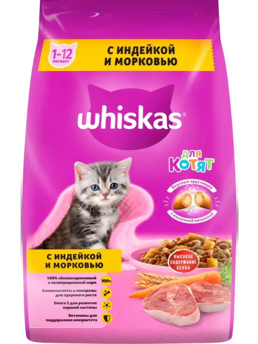 Корм Whiskas для котят, подушечки с молочной начинкой, с индейкой и морковью, 350 г. Это сбалансированный рацион для здоровой и счастливой жизни Вашего котенка. Хрустящие подушечки с молоком внутри обязательно придутся по вкусу Вашему любимцу. Кроме того, Whiskas содержит все необходимое, чтобы еда Вашей кошки была не только вкусной, но и полезной. Whiskas это: Оптимальное сочетание питательных веществ и нутриентов для подержания обмена веществ Витамин Е и цинк для иммунитета Омега-6 и цинк для здоровья кожи и шерсти Баланс кальция и фосфора для здоровья костей Витамин А и таурин для хорошего зрения Высокоусваиваемые ингредиенты и клетчатка для пищеварения Сухая структура корма для удаления зубного налета Пищевая ценность Содержание питательных веществ (100г): белок - 32г; жир - 13,5г; зола - 8,5г; клетчатка - 1,5г; влажность - не более 10г. Энергетическая ценность (100 г) 370 Ккал / 1549 кДж. Состав Состав: продукты растительного происхождения (в том числе злаки, морковь), продукты животного происхождения (в том числе мука из индейки), жиры и масла (в том числе рыбий жир, подсолнечное масло), пивные дрожжи, молочные продукты (в том числе сухое молоко), минеральные вещества (в том числе кальций, цинк, железо), витамины (в том числе витамин А, Е, D3), аминокислоты (в том числе таурин), антиоксиданты, красители. Условия хранения Хранить при температуре от + 4*С до + 35*С и относительной влажности воздуха не более 75 %. Рекомендации по кормлению Whiskas рекомендует сочетать разные форматы корма в рационе Вашей кошки. Утром и вечером Вашей любимице нужно давать влажный рацион, а в течение дня сухой. Это позволит объединить преимущества каждого из форматов, ведь ее рацион должен быть не только вкусным, но и тщательно сбалансированным. В Whiskas в правильных пропорциях собраны все необходимые витамины и минералы, белки, жиры и углеводы, чтобы поддержать здоровье Вашей кошки от усов до кончика хвоста.