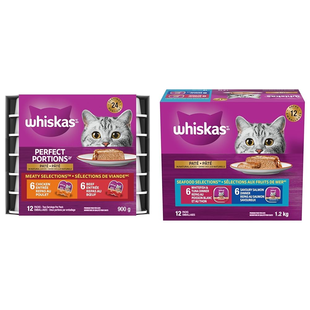 WHISKAS Perfect Portions Meaty Selections Adult Wet Cat Food Pat 12x75g Tray & Seafood Selections Adult Wet Cat Food Pat Multipack - 6 Whitefish and Tuna 6 Salmon 12x100g Tray Beef Chicken + Cat Food