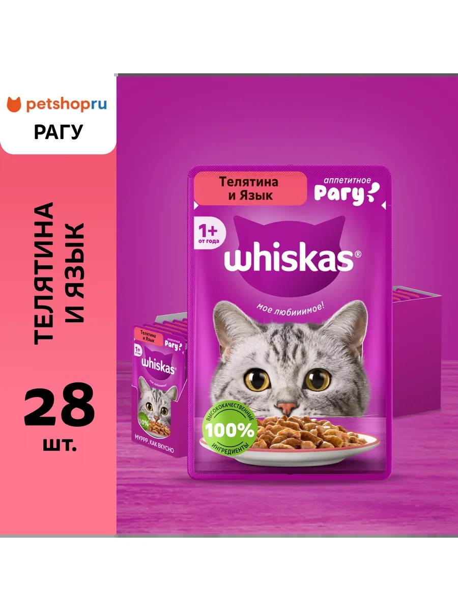 WHISKAS Влажный корм для кошек рагу с телятиной и языком, 28шт х 75г