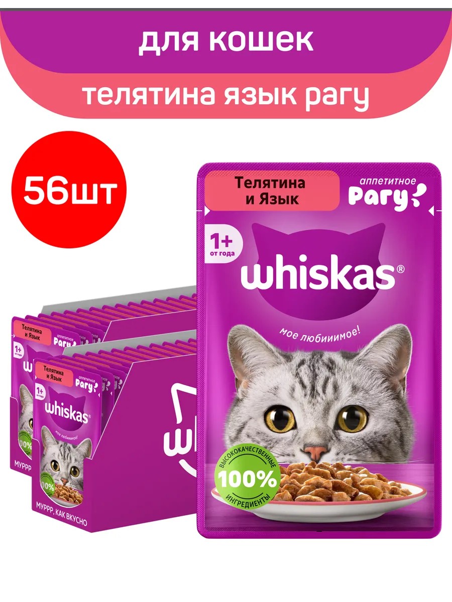 WHISKAS Влажный корм для кошек, рагу телятина язык, 56шт по 75г