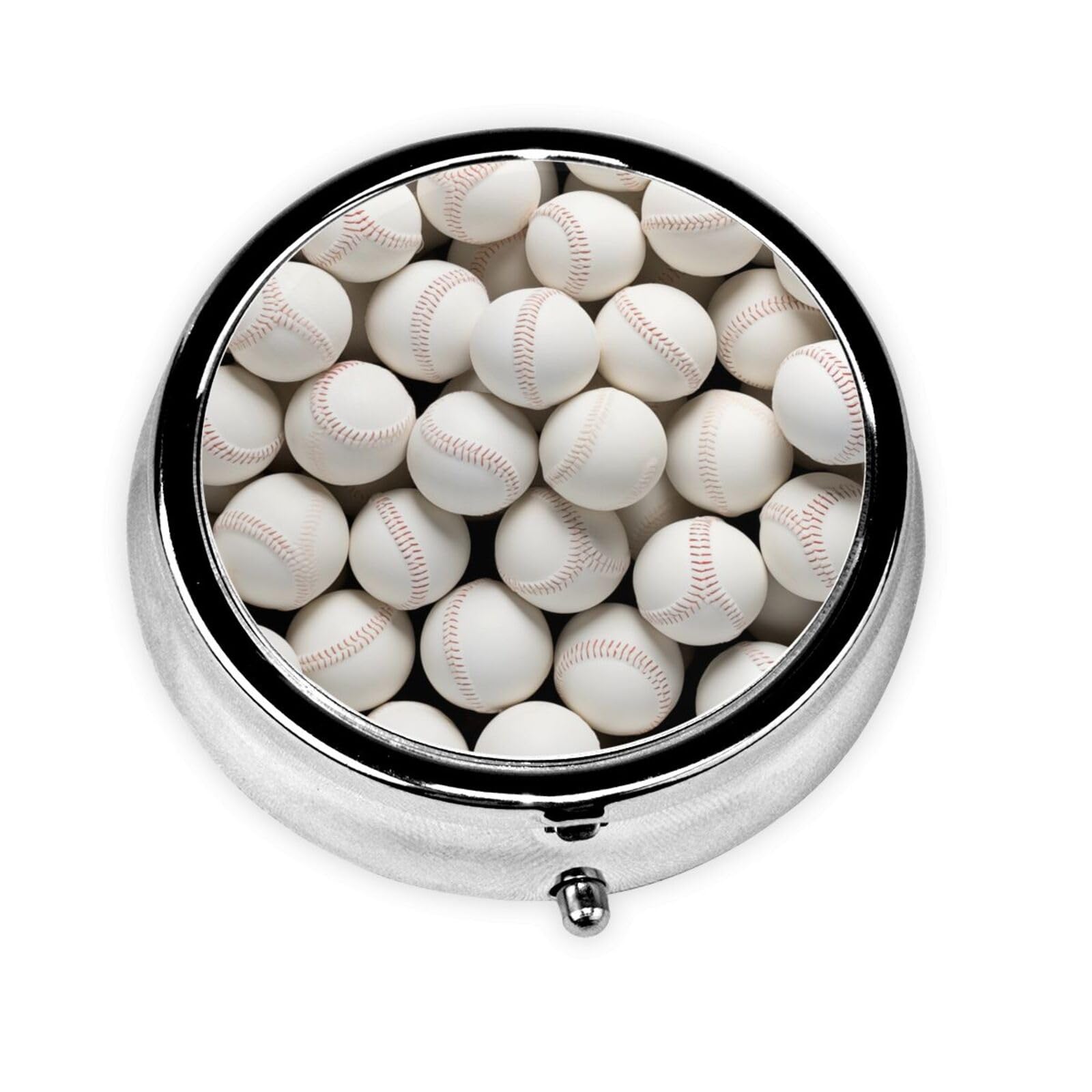 White Baseball Portable Metal Pill Box Round Mini 3-Compartment Plastic Insert hinged Fastening Design Suitable for Small Pills Must-Have for Travel