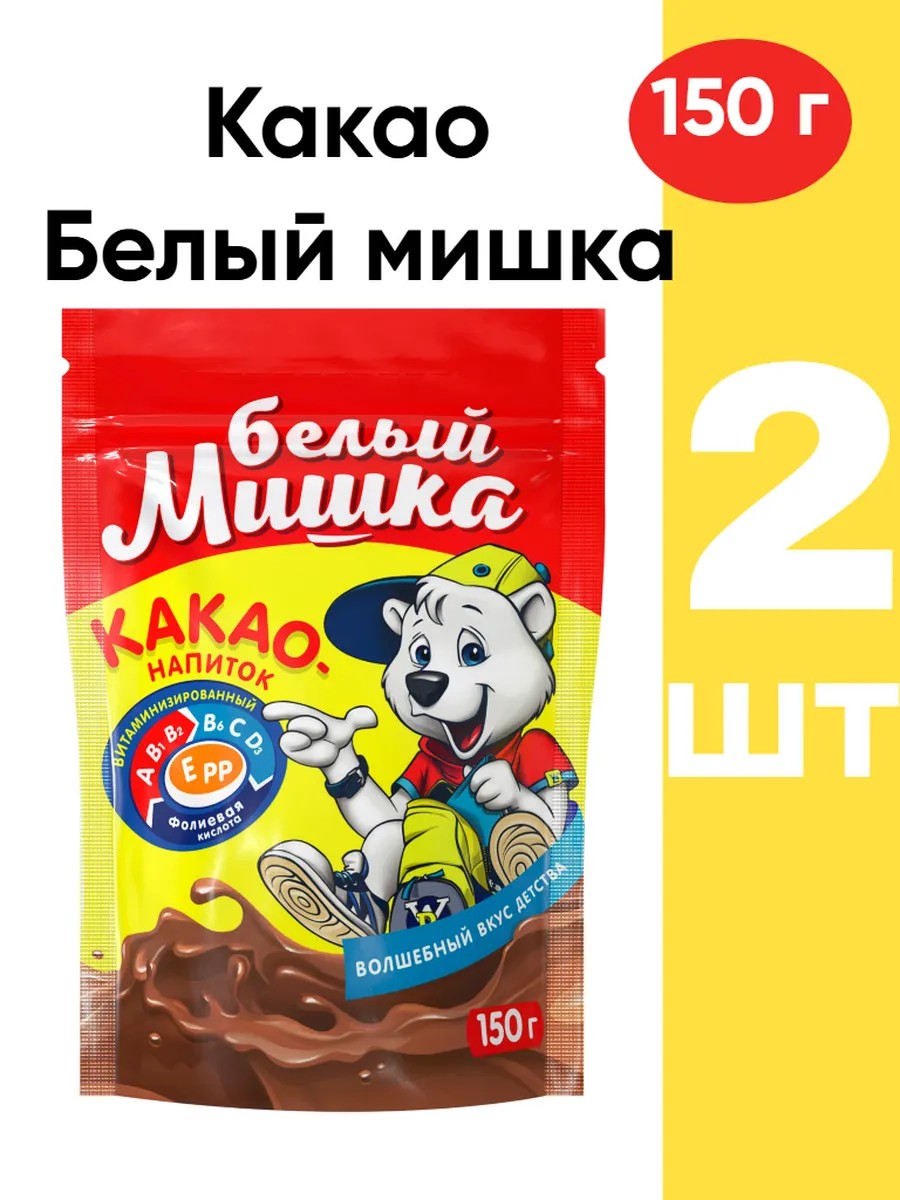 White Bear granulated cocoa improves mood and boosts immunity. This chocolate drink has a bright and rich taste. It contains vitamins E, C, B1, B2, B6, PP, A, D3, and folic acid.