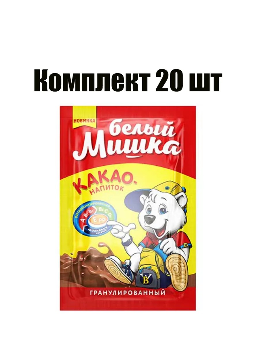 Белый мишка Какао напиток гранулированный растворимый в саше, 25 г, 20 шт. Ищете для ребенка не только вкусный, но и полезный какао напиток? Гранулированный какао Белый мишка улучшает настроение и поднимает иммунитет. Шоколадный напиток обладает ярким и насыщенным вкусом. В нём содержатся витамины: Е, С, В1, В2, В6, РР, А, D3, а также фолиевая кислота. Какао-напиток не содержит искусственных красителей и консервантов, без гмо. В составе какао порошок, изготовленный из какао-бобов высшего качества. Растворимый какао подойдет для приготовления детского молочного напитка, горячего шоколада и выпечки. Какао не требует варки, а значит на приготовление вкусного напитка для детей вам не придется тратить много времени.