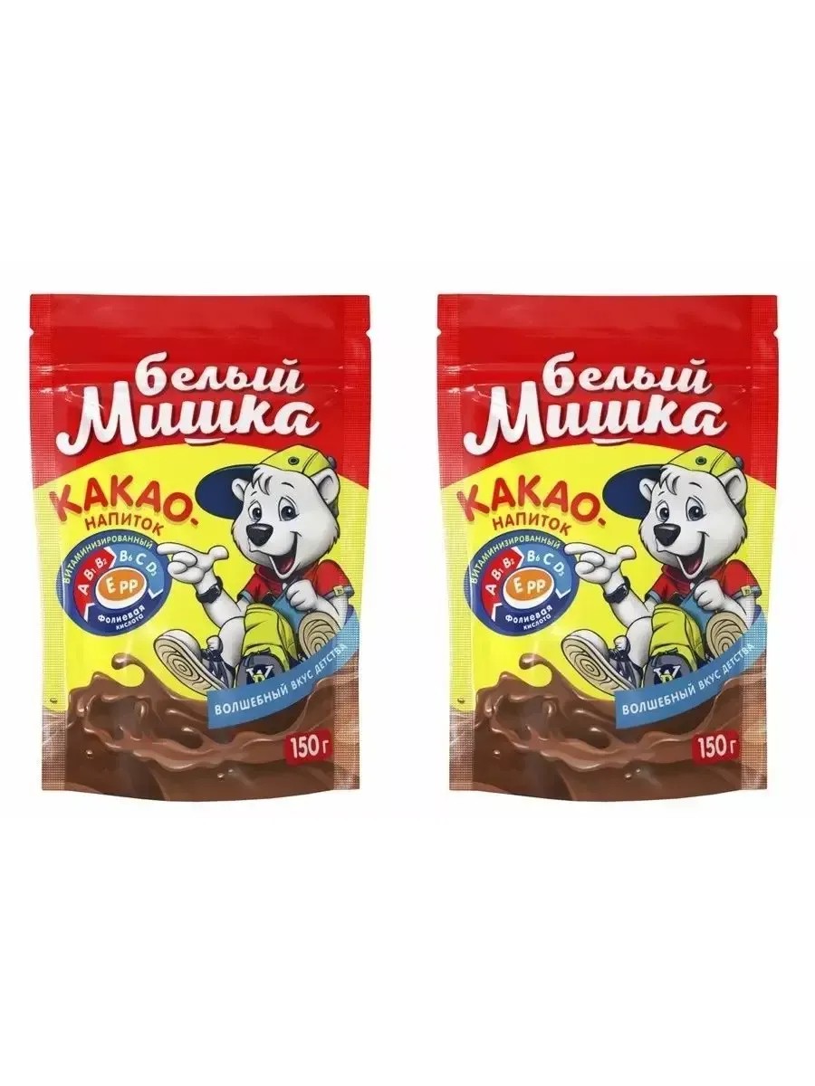 В комплекте 2 упаковки. Общий вес комплекта 300 г. Белый мишка Какао гранулированный. Натуральный насыщенный вкус перетертых какао бобов с добавлением витаминов - это вкусно и полезно. Хорошо знакомый всем поколениям волшебный вкус детства. Обогащен премиксом витаминов и минералов, необходимых для организма. Заряжает энергией.