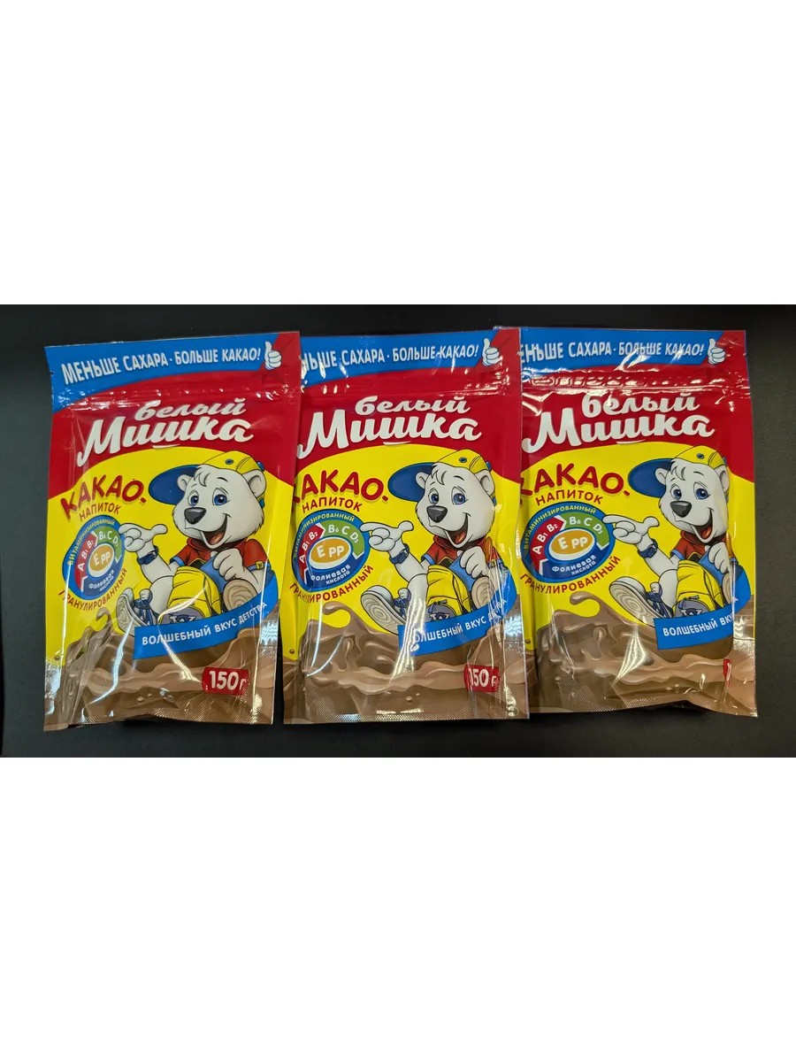 Белый мишка, Какао-напиток гранулированный 150 г, 3 штуки. Для производства напитка используются какао-бобы высшего качества, поэтому готовый напиток имеет однородную густую консистенцию и обладает ярким шоколадным вкусом и ароматом. Способ приготовления: Просто залить кипятком или молоком.