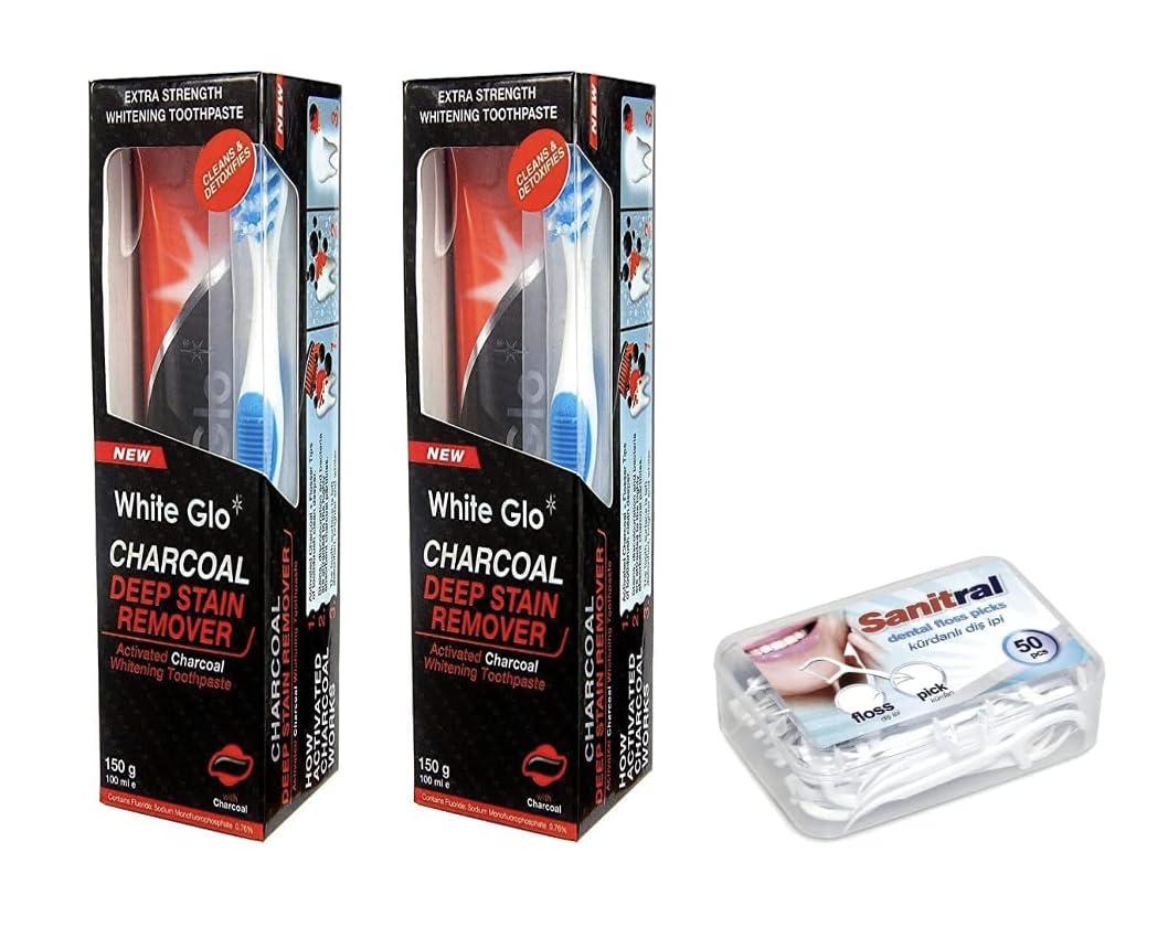 White Glo Charcoal Toothpaste 100ml Pack of 2 with 50 Sanitral Floss Sticks Included as a Gift