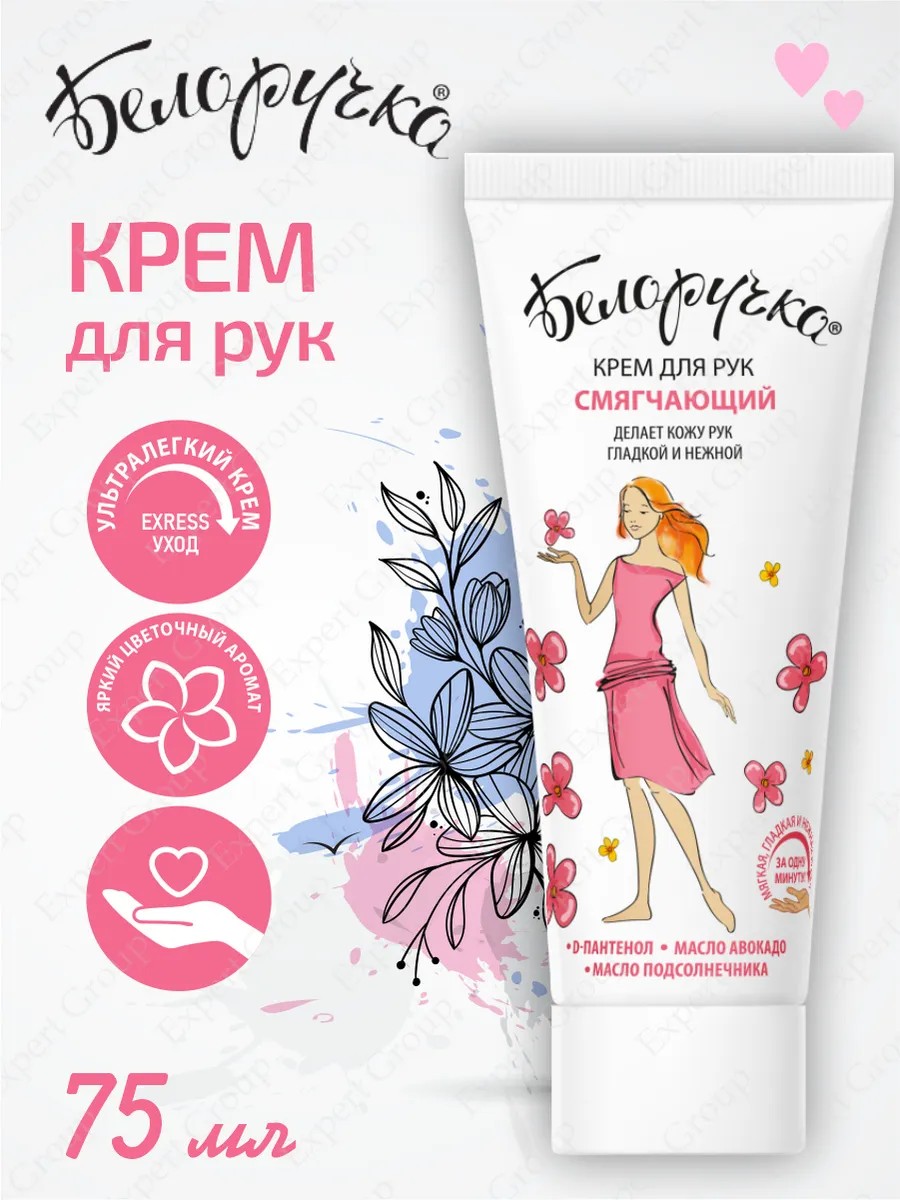 Beloruchka Hand Cream: Softening, Moisturizing, Nourishing, and Protective, 75 ml. Hands are our calling card, and they need daily, high-quality care to prolong their youth and beauty. This hand cream for dry skin contains a deep care complex. This deep care complex includes skin-friendly ingredients for nourishment and hydration. This moisturizing cream softens and nourishes even the driest and most dehydrated skin. This nourishing hand cream for dry skin contains D-Panthenol, avocado oil, and sunflower oil, which soften the skin, help restore the skin's hydrolipid balance, prevent moisture loss, provide antioxidant protection, prevent premature aging, promote nail growth and strength, and maintain elasticity. The gentle formula of this cosmetic product protects the skin from dehydration. Express care - quickly absorbed, soft and beautiful skin in minutes. This moisturizing hand cream is suitable for all skin types. This nourishing hand cream has a light, delicate scent. This moisturizing hand cream for dry skin is perfect for daily use. This 75 ml hand cream is perfect for travel, trips, and use as needed. This hand cream for dry skin is an effective way to enhance the beauty of your hands! This restorative hand cream makes a great gift for a girl or woman, for any occasion or just because. This care product was developed based on the beauty rituals of women from around the world and contains special ingredients. The brand's mission is to empower a new generation of girls and women to live in an atmosphere of positive self-image.