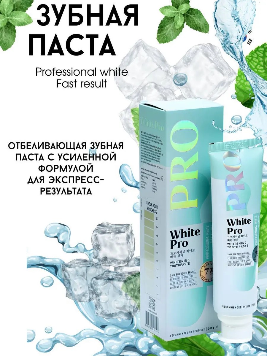Зубная паста White PRO Professional White Fast Result — профессиональное средство для домашнего отбеливания зубов с усиленной формулой. Зубная паста корея отбеливающая от налета и кариеса - удаляет поверхностные пятна и налёт, возвращая естественную белизну и свежесть улыбке уже после нескольких применений.