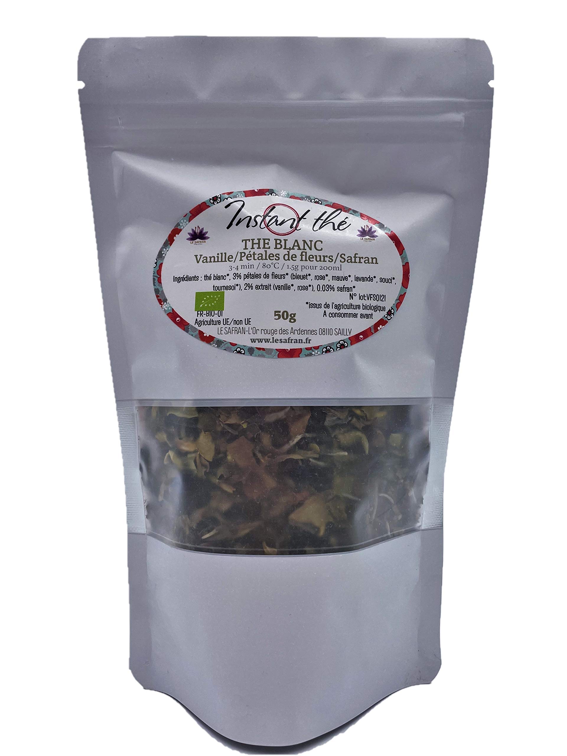 The elegance of white tea with the captivating fragrance of wildflowers, elegantly enhanced by the graceful velvety notes of vanilla and saffron. A truly indulgent tea to savor. Ingredients: white tea , flower petals 3 (cornflower , rose , mallow , lavender , marigold , sunflower ), extracts 2 (vanilla , rose ), 0.35 saffron . Organically grown. Fair Trade. Approximately: 35 cups of tea, nearly 100 saffron threads, 1.5g 200ml cup. To enhance the saffron notes, you can sweeten this tea with our saffron hearts (sugar), saffron syrup, or even saffron honey! INGREDIENTS Ingredients: white tea , flower petals 3 (cornflower , rose , mallow , lavender , calendula , sunflower ), extracts 2 (vanilla , rose ). 0.35 saffron From organic farming.Thé blanc Vanille-Fleurs-Safran, 50g, 35 tasses, certifié BIODESCRIPTION DU PRODUIT DESCRIPTION DU PRODUIT L'élégance du thé blanc au parfum envoûtant des fleurs sauvages, élégamment soutenu par le velouté gracieux de la vanille et du safran. Un thé très gourmand à savourer. Ingrédients : thé blanc , pétales de fleurs 3 (bleuet , rose , mauve , lavande , souci , tournesol ), extraits 2 (vanille , rose ).0.35 safran Issu de l'agriculture biologique. Commerce équitable Environ : 35 tasses de thés, près de 100 filaments de safran, 1,5g tasse de 200ml Pour renforcer les notes de safran, vous pouvez sucrer ce thé avec nos cœurs (sucre) de safran ou encore le sirop de safran et même le miel au safran! INGRÉDIENTS Ingrédients : thé blanc , pétales de fleurs 3 (bleuet , rose , mauve , lavande , souci , tournesol ), extraits 2 (vanille , rose ).0.35 safran Issu de l'agriculture biologique.