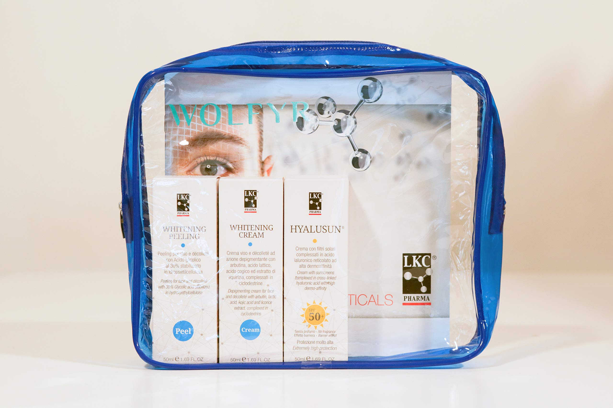 Kit Whitening System consisting of three creams: Whitening Cream based on ARButina - 50 ml LKC Pharma: Whitening Cream is part of the depigmenting line of LKC Pharma: It is an excellent facial and décolleté cream with depigmenting effect, which after whitening makes the skin smooth and supple for longer. Its main ingredients? Arbutin with known whitening properties glycolic acid that prevents the formation of skin spots, lactic acid and licorice with high soothing and softening power. The result is a solution for all skin types, including sensitive skin. Use: cleanse the skin thoroughly, apply the product to cleansed skin with a cotton pad and massage gently. Remove after a few minutes with a damp cloth. Whitening Peeling Cream based on glycolic acid - 50 ml LKC Pharma: Whitening Peeling is part of the LKC Pharma: it is a great treatment for face, neck and décolleté that will make you look visibly younger in no time. Whitening peeling based on glycolic acid with depigmenting and brightening effect, has peeling and keratolytic properties that stimulate skin renewal. Use: cleanse the skin thoroughly, apply the product to cleansed skin with a cotton pad and massage gently. Remove after a few minutes with a damp cloth. Usage time: skin with dark spots: max. 2 minutes, normal pink skin: max. 4 minutes. Dark and or oily skin: max. 5 minutes Hyalusun SPF 50, sun protection - 50 ml LKC pharma: HYALUSUN SPF 50 sun protection offers a broad spectrum of UV-A and UV-B rays, the main causes of photoaging. Its strength is the innovative Dermahyal Sun system, which reduces the skin absorption of chemical filters and has been developed for particularly sensitive skin. The result? Long-term protection against burns INGREDIENTS AQUA, PENTYLENE GLYCOL, ARBUTIN, CYCLODEXTRIN, HYDROXYETHYL ACRYLOYLDIMETHYL TAURATE COPOLYMER, GLYCERIN, Squalane, PROPYLENE GLYCOL, TITANIUM DIOXIDE, DIBUTYL ADIPATE, THYLHEXYL Triasone. Polysorbate 60, BIS-ETHYLHEXYLOXYPHENOL METHOXYPHENYL TRIAZIN, ETHOXYDIGLYCOL, GLYCYRRHIZA GLABRA ROOT, DIETHYLAMINO HYDROXYBENZOYL HEXYL BENZOATE, TOCOPHERYL ACETATE, LACTIC AD, SODIUM HYDIUM ALURONATES SSPOLYMER, SODIUM METABISULPHITE, SODIUM CHLORIDE, SODIUM HYDROXIDE. Aqua, GLYCOLIC AGIO, HYDROXYETHYLCELLULOSE.Whitening peeling is suitable for solving problems such as: dark spots, micropigmentation, small superficial dysdromes and hypersensitivity of the skin. In addition, it increases the whitening effect. Whitening Peeling is part of the pigment line manufactured by LKC Pharma. It is an excellent treatment for face, neck and décolleté, giving you a visibly younger appearance in a short time. Whitening peeling, based on glycolic acid with depigmenting and brightening effect, has peeling and keratolytic properties that stimulate skin renewal. The whitening cream is part of the pigment line produced by LKC Pharma. It is an excellent face and décolleté cream that, used after bleaching, makes your skin smooth and supple for longer. Main ingredients? arbutin, with known whitening properties glycolic acid, prevents the formation of skin spots lactic acid and licorice, with a high soothing and soothing effect. Hyalusun SPF 50 sun protection provides broad spectrum UV-A and UV-B protection, which are the main causes of photoaging. Its strength is the innovative Dermahyal Sun system, which reduces the absorption of chemical filters and has been developed for very sensitive skin. The result? Long-lasting protection against sunburn. Practical transparent box consisting of three creams.Whitening System met Hyalusun 50, Whitening Cream Whitening Peeling - LKC Pharma Kit Whitening System bestaande uit drie crèmes: Whitening Cream op basis van ARButina - 50 ml LKC Pharma: Whitening Cream maakt deel uit van de ontpigmentingslijn van LKC Pharma: Het is een uitstekende gezichts- en decolleté crème met depigmenterende werking, die na het bleken de huid langer glad en soepel maakt. Zijn belangrijkste bestanddelen? Arbutin met bekende witmakende eigenschappen glycolzuur dat de vorming van huidvlekken tegengaat, melkzuur en drop met hoge kalmerende en weekmakerkracht. Het resultaat is een oplossing voor alle huidtypes, ook voor de gevoelige huid. Gebruik: reinig de huid grondig, breng het product aan op de gereinigde huid met een wattenschijfje en masseer het zachtjes in. Na enkele minuten met een vochtige doek verwijderen. Whitening Peeling Cream op basis van glycolzuur – 50 ml LKC Pharma: Whitening Peeling maakt deel uit van de LKC Pharma: het is een geweldige behandeling voor gezicht, hals en decolleté waarmee je er in een mum van tijd zichtbaar jonger uitziet. Whitening peeling op basis van glycolzuur met depigmenterende en verhelderende werking, heeft peeling- en keratolytische eigenschappen die de huidvernieuwing stimuleren. Gebruik: reinig de huid grondig, breng het product aan op de gereinigde huid met een wattenschijfje en masseer het zachtjes in. Na enkele minuten met een vochtige doek verwijderen. Gebruiksduur: huid met donkere vlekken: max. 2 minuten normale roze huid: max. 4 minuten. Donkere en of vettige huid: max. 5 minuten Hyalusun SPF 50, zonnebescherming - 50 ml LKC farma: HYALUSUN SPF 50 zonnebescherming biedt een breed spectrum van UV-A en UV-B-stralen, belangrijkste oorzaken voor fotoveroudering Zijn sterkte is het innovatieve Dermahyal Sun-systeem, dat de huidopname van chemische filters vermindert en voor de bijzonder gevoelige huid is ontwikkeld. Het resultaat? Langdurige bescherming tegen brandwonden INGREDIËNTEN AQUA, PENTYLEENE GLYCOL, ARBUTIN, CYCLODEXTRIN, HYDROXYETHYL ACRYLOYLDIMETHYL TAURATE COPOLYMER, GLYCERIN, Squalane, PROPYLENE GLYCOL, TITANIUM DIOXIDE, DIBUTYL ADIPATE, THYLHEXYL Triasone. Polysorbaat 60, BIS-ETHYLHEXYLOXYPHENOL METHOXYPHENYL TRIAZIN, ETHOXYDIGLYCOL, GLYCYRRHIZA GLABRA ROOT, DIETHYLAMINO HYDROXYBENZOYL HEXYL BENZOATE, TOCOPHERYL ACETATE, LACTIC AD, SODIUM HYDIUM ALURONATEN SSPOLYMER, SODIUM METABISULFITE, SODIUM CHLORIDE, SODIUM HYDROXIDE. Aqua, G