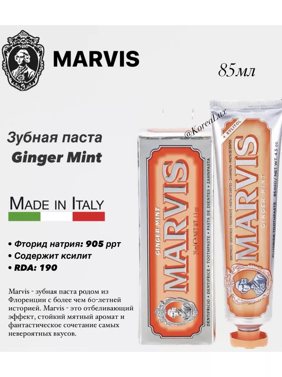 Зубная паста Marvis Ginger Mint Марвис Мята и Имбирь - 85мл. Освежающее сплетение ароматов мяты и имбиря оставит незабываемое впечатление при чистке зубов. Уровень абразивности пасты – 105 RDA, содержит в себе частички диоксида кремния, наиболее безопасного для зубов природного абразива, который эффективно, но мягко удаляет налет и полирует эмаль, не повреждая ее. Гигиеническое средство обеспечивает профилактику и защиту зубов и десен при ежедневном использовании. Концентрация фторидов в составе пасты - 905 ppm, что снижает способность бактерий перерабатывать сахар в кислоту, которая разрушает эмаль и способствует ее ускоренной реминерализации. Marvis это фантастическая зубная паста из Флоренции, которая известна более 60 лет. Пасты отличаются уникальной кремообразной текстурой и отличными очищающими свойствами. Входящая в состав целлюлозная смола делает пасту похожей на густые сливки и предотвращает ее высыхание и расслоение, ксилитол защищает зубы от кариеса и укрепляет, а деликатные абразивные вещества бережно удаляют зубной налет и мягко полируют эмаль, не повреждая и не царапая ее. Эта зубная паста - элегантный способ освежиться! Привкус специй создает взрыв экзотики, который вы запомните надолго. По-настоящему приятное и интересное открытие. Массовая доля фторида 0.0905% (905 ppm).