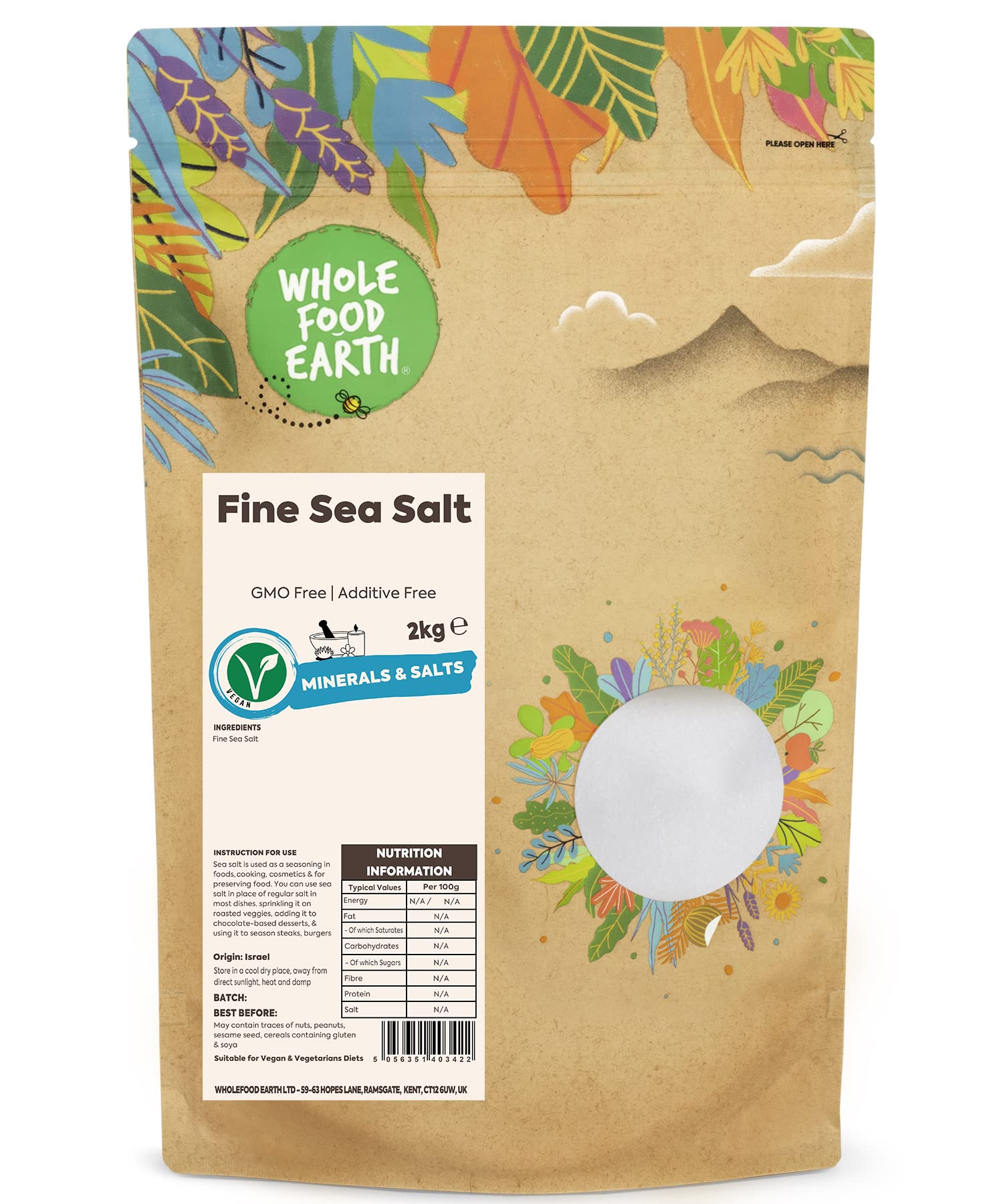 Sea salt is produced by direct evaporation of salt water. It is normally unprocessed or just lightly processed, retaining traces of minerals. Sea salt is rich in minerals along with other useful components. Sea salt is rich in minerals and natural healing components similar to those found in skin cells. This makes it an excellent natural component for medicinal and cosmetic applications. Extracted from the mineral treasure inherent in salt water, sea salt extracts 82 critical trace elements. These natural minerals are important for the proper functioning of the body. Fine sea salt without GMO. We believe that good food should not cost the earth, as such sustainability means a lot to us. That's why we work tirelessly to find sustainable solutions across our business. We have rolled out brand new 100 recyclable packaging on Wholefood Earth products. The new packaging is suitable for curbside recycling. Thank you for knowing that it's what's inside that counts. For wanting a future without toxins in the food your children eat. For emphasizing the responsibility that traces food to its source. To protect the biodiversity that nourishes animal habitats and makes crops thrive. And, from everyone here at Wholefood Earth, thank you for using your purchg power to make meaningful, informed choices that will continue to feed our people and our planet today, tomorrow, and forever. We are here for a healthier earth, a sustainable and healthy earth. INGREDIENTS Fine sea salt. DIRECTIONS FOR USE Suitable for vegans and vegetarians. Read labels for any allergens before use. Ingredients: Fine Sea Salt. Item Count: 1 - Unit Count: 2000 - Unit Count: Number - Country Strings: Israel - Instructions: Suitable for vegans and vegetarians. Read labels for any allergens before use. Fine sea salt is non-GMO, good for vegans, it is dairy-free, and it is unrefined. Sea salt contains a quantity of several minerals and natural healing elements like those found on skin cells. This makes it a very good natural ingredient to use for therapeutic treatments. The nutritional richness of sea salt includes vital minerals such as sodium, potassium, calcium, magnesium, bromide, chloride, iron, copper, and zinc, among other beneficial elements. Sea salt derives 82 essential trace nutrients from the mineral treasure found in seawater these natural minerals are valuable for the proper functioning of the body. It is used as a seasoning in food, cooking, cosmetics, and for food preservation. It is also called bay salt, solar salt, just like mined rock salt. Le sel de mer est produit par évaporation directe de l'eau salée. Il est normalement non transformé ou simplement légèrement traité, conservant des traces de minéraux. Le sel de mer est riche en minéraux avec d'autres composants utiles. Le sel de mer est riche en minéraux et composants naturels de guérison similaires à ceux présents dans les cellules de la peau. Cela en fait un excellent composant naturel pour les applications médicinales et cosmétiques. Extrait du trésor minéral inhérent à l'eau salée, le sel de mer extrait 82 oligo-éléments critiques. Ces minéraux naturels sont importants pour le bon fonctionnement du corps. Sel marin fin sans OGM. Nous pensons qu'une bonne nourriture ne devrait pas coûter à la terre, en tant que telle, la durabilité compte beaucoup pour nous. C'est pourquoi nous travaillons sans relâche pour trouver des solutions durables dans l'ensemble de notre entreprise. Nous avons déployé un tout nouvel emballage 100 recyclable sur les produits Wholefood Earth Le nouvel emballage est adapté au recyclage sur le trottoir. Merci de savoir que c'est ce qu'il y a à l'intérieur qui compte. Pour vouloir un avenir sans toxines dans la nourriture que vos enfants mangent. Pour avoir insisté sur la responsabilité qui retrace la nourriture à sa source. Pour protéger la biodiversité qui nourrit les habitats des animaux et fait prospérer les cultures. Et, de la part de tout le monde ici chez Wholefood Earth, merci d'utiliser votre pouvoir d'achat pour faire des choix significatifs et éclairés qui continueront à nourrir nos gens et notre planète aujourd'hui, demain et pour toujours. Nous sommes là pour une terre plus saine, une terre durable et saine. INGRÉDIENTS Sel de mer fin. MODE D'EMPLOI Convient aux végétaliens et aux végétariens. Lire les étiquettes pour tout allergène avant utilisation. Ingrédients : sel de mer fin. Nombre d'articles : 1 - Nombre d'unités : 2000 - Nombre d'unités : nombre - Cordes de pays : Israël - Instructions : convient aux végétaliens et végétariens. Lire les étiquettes pour tout allergène avant utilisation. Le sel de mer fin est sans OGM, bon pour les végétaliens, il est sans produits laitiers et il n'est pas raffiné. Le sel de mer contient une quantité de plusieurs minéraux et d'éléments de guérison naturels comme ceux trouvés sur les cellules de la peau. Cela en fait un très bon ingrédient naturel à utiliser pour les traitements thérapeutiques. La richesse nutritionnelle du sel de mer comprend des minéraux vitaux tels que le sodium, le potassium, le calcium, le magnésium, le bromure, le chlorure, le fer, le cuivre et le zinc, entre autres éléments bénéfiques. Le sel de mer dérive 82 oligo-nutriments essentiels du trésor minéral présent dans l'eau de mer, ces minéraux naturels sont précieux pour le bon fonctionnement du corps. Il est utilisé comme assaisonnement dans les aliments, la cuisine, les cosmétiques et pour la conservation des aliments. On l'appelle aussi sel de laurier, sel solaire. Tout comme le sel gemme miné.