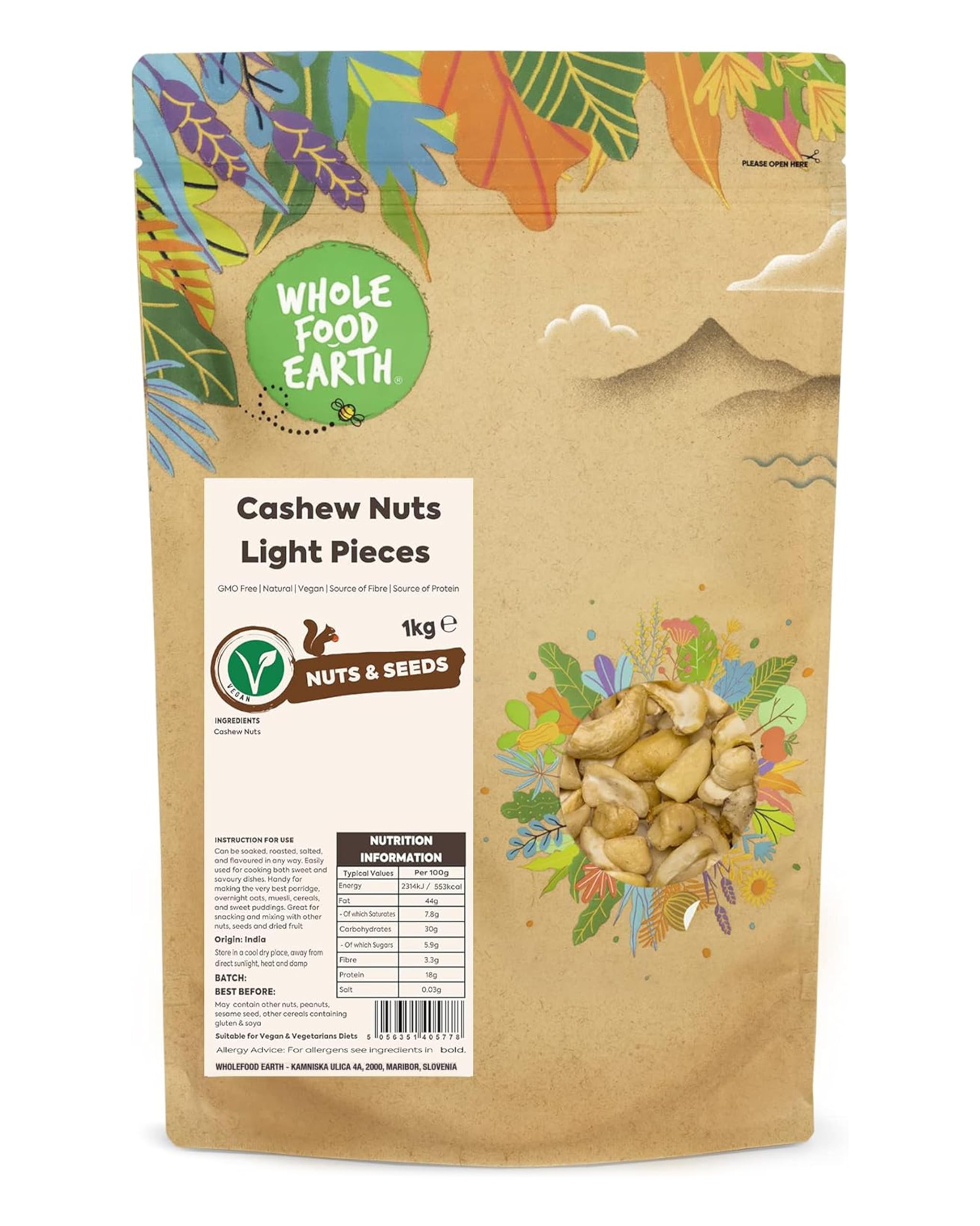 html body p : Cashews are among the most popular nuts on the market and are delicious roasted sweetened or salted. Cashews have been consumed since ancient times and their benefits are undeniable. They have long been prized for their sweet taste gentle crunch and nutritional properties. Cashews are rich in protein and vitamins among other essential nutrients. Cashews are also rich in heart-healthy fatty acids. These important fatty acids support a healthy body. Natural non-GMO cashew pieces are suitable for vegans. We believe good food shouldn't be expensive so sustainability is very important to us. That's why we work tirelessly to find sustainable solutions across all our operations. We've created new 100 recyclable packaging for Wholefood Earth products. The new packaging is fully recyclable. Thank you for understanding that what's inside matters. For the desire for a future free of toxins in your children's food. For insisting on food traceability back to its source. For protecting biodiversity preserving animal habitats and helping crops thrive. Wholefood Earth thanks you for using your purchg power to make wise and informed decisions that will feed our people and our planet today tomorrow and forever. We are committed to a healthier and more sustainable Earth. Ingredients: Cashews. P.when('A').execute(function(A) A.on('a:expander:toggle_description:toggle:collapse' function(data) window.scroll(0 data.expander. expander 0 .offsetTop-100) ) ) Directions: Cashews can be soaked roasted salted and seasoned in any way. They're easy to use in sweet and savory dishes as well as delicious oatmeal overnight oats muesli and sweet puddings. Ideal as a snack and for mixing with other nuts seeds and dried fruit. See more br/ br/ Authentic Quality Verified: Rigorously selected by our experts naturally sweet taste and melt-in-your-mouth texture no complex ingredients just the pure goodness of cashews. Simple Culinary Versatility: Perfect dipped roasted or plain for overnight oats porridges muesli snacks or sweet and savory recipes one ingredient endless possibilities. Ethically Sourced and Traceable: Grown in India with a commitment to biodiversity and habitat protection every purchase supports responsible and sustainable farming practices. Trusted Certifications: 100 non-GMO vegan dairy-free and no added sugar recyclable kraft packaging reflecting our values of sustainability and transparency. Dense Nutrition Without Compromise: Rich in protein and vitamins with heart-healthy fatty acids these natural chunks support your daily vitality and long-term well-being. br/ br/ Description du produit Les noix de cajou sont parmi les noix les plus populaires sur le march et sont d licieuses grill es sucr es ou sal es. Les noix de cajou sont consomm es depuis que les gens peuvent les manger et leur bienfaits ne font aucun doute. Elles ont longtemps t appr ci es pour leur go t sucr leur croquant doux et leurs propri t s nutritives. Les noix de cajou sont riches en prot ines et en vitamines entre autres l ments essentiels. Les noix de cajou sont riches en acides gras sains pour le c ur. Ces acides gras importants soutiennent un corps sain. Les morceaux de noix de cajou naturelles et sans OGM conviennent aux v g taliens. Nous pensons que la bonne nourriture ne devrait pas tre ch re la durabilit nous tient donc tr s c ur. C'est pourquoi nous travaillons sans rel che pour trouver des solutions durables dans l'ensemble de nos activit s. Nous avons cr de nouveaux emballages 100 recyclables pour les produits Wholefood Earth. Le nouvel emballage est enti rement recyclable. Merci pour votre compr hension que c'est l'int rieur qui compte. Pour le d sir d'un avenir sans toxines dans la nourriture de vos enfants. Pour le fait d'insister sur la tra abilit des aliments jusqu' leur source. Pour prot ger la biodiversit pr server les habitats animaux et faire prosp rer les cultures. Wholefood Earth vous remercie d'utiliser votre pouvoir d'achat pour prendre des d cisions judicieuses et clair es qui alimenteront nos peuples et notre plan te aujourd'hui demain et pour toujours. Nous nous engageons pour une terre plus saine et durable. Ingr dients Noix de cajou P.when('A').execute(function(A) A.on('a:expander:toggle_description:toggle:collapse' function(data) window.scroll(0 data.expander. expander 0 .offsetTop-100) ) ) Mode d'emploi Les noix de cajou peuvent tre tremp es r ties sal es et assaisonn es de n'importe quelle mani re. Elles sont faciles utiliser pour la pr paration de plats sucr s et sal s ainsi que pour des porridges d'avoine d licieux des overnight oats des mueslis et des poudings sucr s. Id ales comme en-cas et m langer avec d'autres noix graines et fruits secs. Voir plus br/ br/ Qualit Authentique V rifi e: s lectionn es rigoureusement par nos experts go t sucr naturel et texture fondante aucun ingr dient complexe juste la puret des noix de cajou. Polyvalence Culinaire Simple: parfaites tremp es r ties ou nature pour overnight oats porridges mueslis en-cas ou recettes sucr es et sal es une seule ingr dient infinies possibilit s. Sourcing thique Tra able: cultiv es en Inde avec engagement envers la biodiversit et la protection des habitats chaque achat soutient des pratiques agricoles responsables et durables. Certifications de Confiance: 100 sans OGM vegan sans produits laitiers et sans sucre ajout emballage kraft recyclable refl tant nos valeurs de durabilit et transparence. Nutrition Dense Sans Compromis: riches en prot ines et vitamines avec acides gras sains pour le c ur ces morceaux naturels soutiennent votre vitalit quotidienne et votre bien- tre long terme. br/ br/ Wholefood Earth Noix de Cajou Morceaux - Sans OGM Naturel Vegan Prot ine 1 kg /p /body /html
