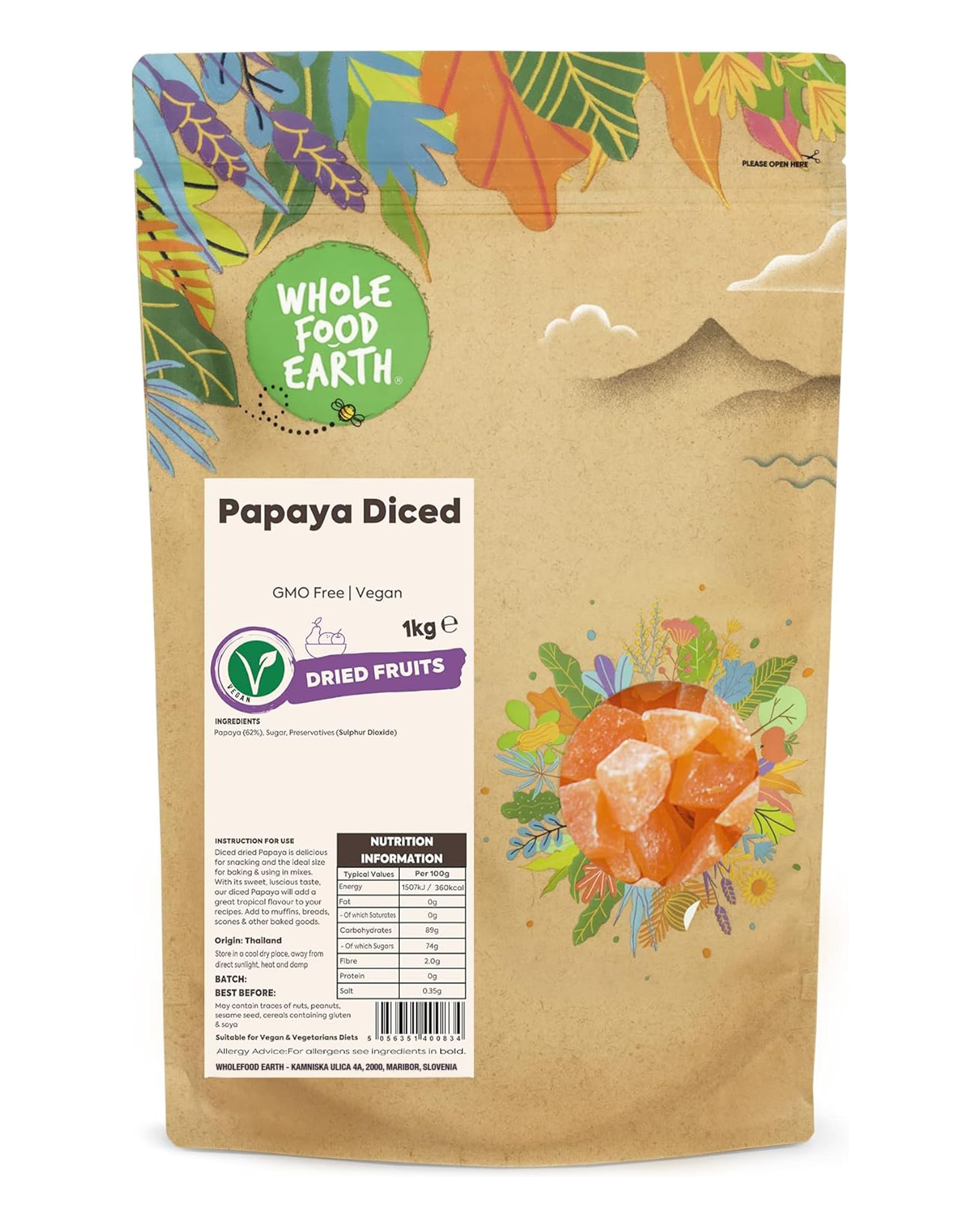 html body p : These dried papaya cubes are made from delicious juicy ripe papaya similar to our papaya sticks but cut into small pieces. If you're looking for a snack diced papaya is perfect for a variety of occasions. You can take a bowl of chopped papaya and use it in different dishes. We highly recommend it. While papaya is known for its digestive properties it has many other benefits. Each serving is packed with beneficial antioxidants minerals vitamins and electrolytes. They're the perfect accompaniment to a yogurt parfait. Other information about the papaya slices: They're easy to carry and eat so you can enjoy them at home or on the go. We believe good food shouldn't be expensive so sustainability is very important to us. That's why we work tirelessly to find sustainable solutions across all our operations. We've created new 100 recyclable packaging for Wholefood Earth products. The new packaging is fully recyclable. Thank you for understanding that it's what's inside that matters. For your desire for a future free of toxins in your children's food. For insisting on food traceability back to its source. For protecting biodiversity preserving animal habitats and helping crops thrive. Wholefood Earth thanks you for using your purchg power to make wise and informed decisions that will feed our people and our planet today tomorrow and forever. We are committed to a healthier and more sustainable Earth. Ingredients: Papaya (62 ) sugar preservatives (sulfur dioxide) br/ br/ Eco-friendly packaging: Recyclable packaging for reduced environmental impact suitable for vegans GMO-free and dairy-free respectful of the planet. Versatile in the kitchen: Ideal in pastries muesli yogurt or salads these papaya pieces add an exotic and flavorful touch to all your dishes. Healthy snack: Perfect as an energy-boosting snack on the go these papaya cubes offer a delicious alternative to processed sweets while remaining natural. Nutrient-rich: Enjoy essential vitamins minerals antioxidants and electrolytes that promote a balanced diet and contribute to healthy digestion. Superior quality: Carefully selected dried papaya for optimal freshness and flavor grown in a tropical climate for an authentic and natural taste. br/ br/ Description du produit Ces cubes de papaye s ch e sont fabriqu s partir de d licieuse papaye juteuse m rie semblable nos b tonnets de papaye mais coup es en petits morceaux. Si vous tes la recherche d'une collation les papayes en d s sont parfaites pour diff rentes occasions. Vous pouvez prendre un bol de papaye hach e et l'utiliser dans diff rents plats. Nous vous y invitons vivement. Bien que la papaye soit connue pour ses propri t s digestives elle poss de de nombreux autres avantages. Chaque portion est remplie d'antioxydants de min raux de vitamines et d' lectrolytes b n fiques. Ce sont les compagnons id aux d'un parfait au yaourt. Autre information sur les tranches de papaye : Elles sont faciles transporter et manger de sorte que vous pouvez les d guster la maison ou en d placement. Nous pensons que la bonne nourriture ne devrait pas tre ch re la durabilit nous tient donc tr s c ur. C'est pourquoi nous travaillons sans rel che pour trouver des solutions durables dans l'ensemble de nos activit s. Nous avons cr de nouveaux emballages 100 recyclables pour les produits Wholefood Earth. Le nouvel emballage est enti rement recyclable. Merci pour votre compr hension que c'est l'int rieur qui compte. Pour le d sir d'un avenir sans toxines dans la nourriture de vos enfants. Pour le fait d'insister sur la tra abilit des aliments jusqu' leur source. Pour prot ger la biodiversit pr server les habitats animaux et faire prosp rer les cultures. Wholefood Earth vous remercie d'utiliser votre pouvoir d'achat pour prendre des d cisions judicieuses et clair es qui alimenteront nos peuples et notre plan te aujourd'hui demain et pour toujours. Nous nous engageons pour une terre plus saine et durable. Ingr dients INGR DIENTS : Papaye (62 ) sucre conservateurs (dioxyde de soufre) br/ br/ Emballage cologique : Conditionnement recyclable pour un impact environnemental r duit adapt pour v gan sans OGM ni produits laitiers respectueux de la plan te. Polyvalence en cuisine : Id al dans les p tisseries mueslis yaourts ou salades ces morceaux de papaye apportent une touche exotique et savoureuse tous vos plats. Snack sain : Parfait en collation nerg tique emporter ces d s de papaye offrent une alternative gourmande aux sucreries industrielles tout en restant naturels. Riche en nutriments : Profitez des vitamines min raux antioxydants et lectrolytes essentiels qui favorisent une alimentation quilibr e et contribuent une digestion saine. Qualit sup rieure : Papaye s ch e soigneusement s lectionn e pour une fra cheur et une saveur optimales cultiv e en climat tropical pour un go t authentique et naturel. br/ br/ Wholefood Earth Papaye S ch e Morceaux 1kg V gan Sans Produits Laitiers Riches en Antioxydants Sans OGM Snack Id al et Cuisiner Facile Papaye Naturelle Premium /p /body /html