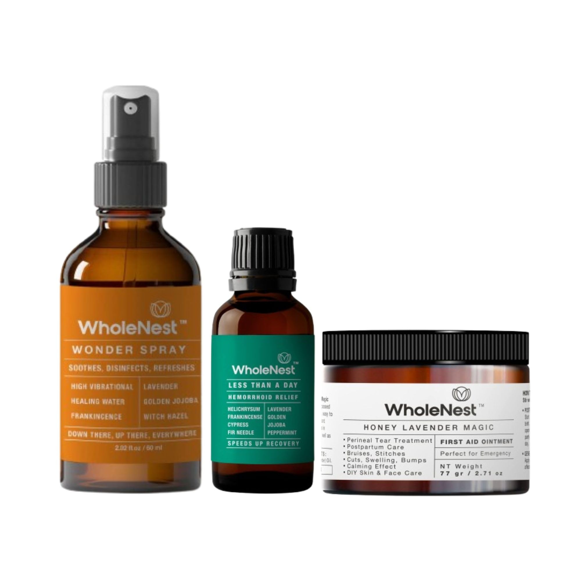 Experience gentle postpartum recovery with WholeNest's Postpartum Care Kit. Featuring Wonder Spray Postpartum Essentials, Honey Lavender Magic Perineal Liquid Balm, and Less Than A Day Hemorrhoid Relief Essential Oil, this kit soothes discomfort, supports recovery, and promotes perineal care for new moms. Perfect for addressing postpartum stitches, C-section scars, and fissures, these all-natural solutions are crafted with calming ingredients like witch hazel, honey, and essential oils to provide relief and comfort. Safe, effective, and easy to use, this kit is an essential addition to any postpartum care routine.