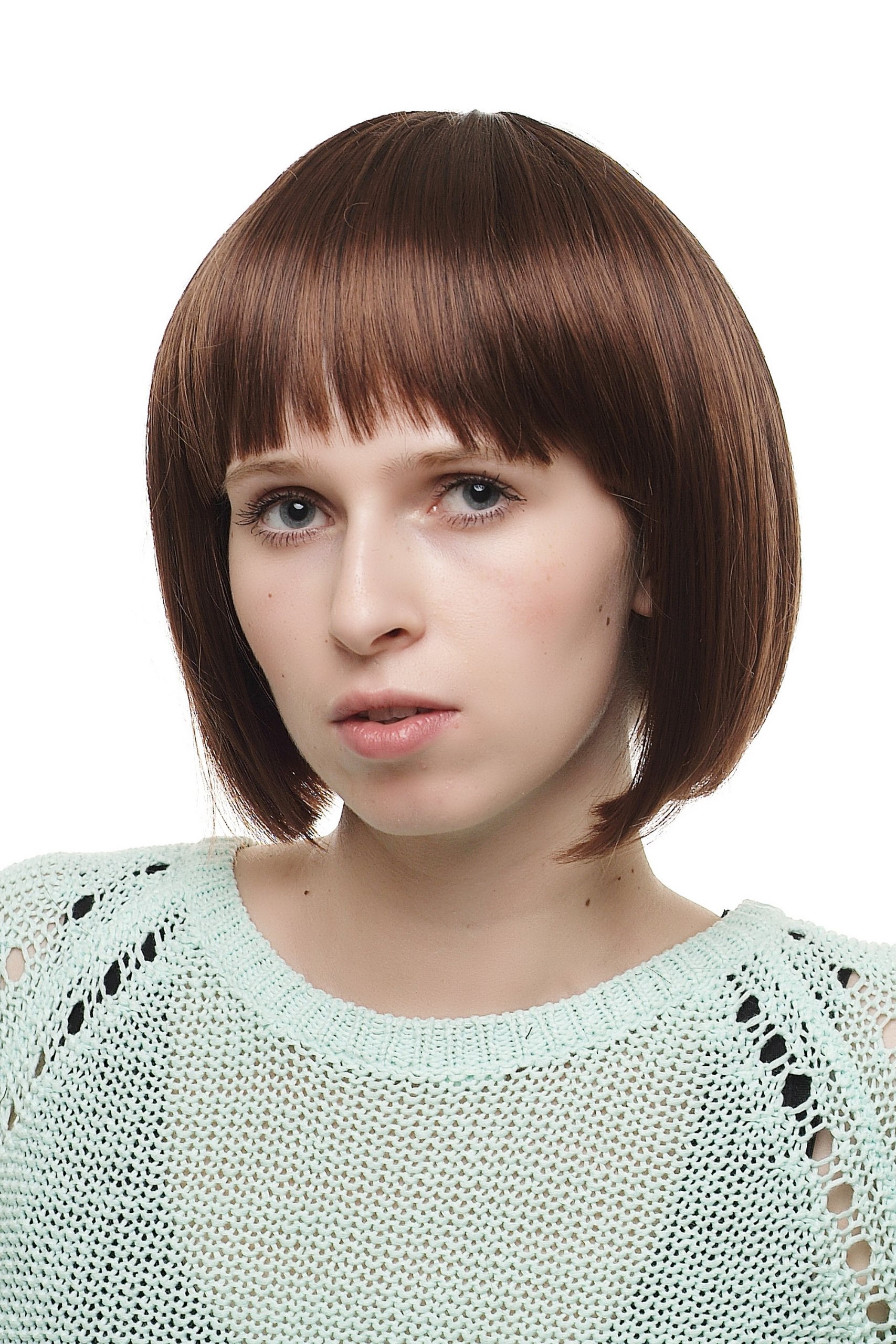 fiber.100% polyester.~ Article number: 2304-2T30 (418) ~ Brand: Wig Me Up.Short women's bob with smooth hair in mixed brown tones. Qualitätsperücken der Marke WIG ME UP von VK Event Fashion empfehlen sich mit sorgfältiger Verarbeitung und lebensechter Wirkung für den Alltag. Die Perücken sind verfügbar in vielen hundert populären Haarschnitten für die Verwendung aus höchstpersönlichen Gründen, für Crossdressing, für die Zeit bis zum eigenen, langen, vollen Haar. Aber auch Perückenmodelle in extravaganten Farben oder historischen Frisuren für Cosplay, Theater, Film, LARP und Historienspiel finden Sie unter dieser beliebten Marke in der selben überzeugenden Qualität. Bei dieser Tressenperücke sind die Haare aus hochwertiger, täuschend echter Kunstfaser auf einer offenen Perückenkappe fest vernäht. Solche Perückenkappen garantieren mit einer optimalen Luftzirkulation und ihrem geringen Gewicht einen hohen Tragekomfort. Die Perücke passt bequem auf einen Kopfumfang von bis zu 60 cm. Auf kleinere Kopfgrößen wird die Perücke mittels eines Systems aus Häkchen und Laschen, die hinten in der Kappe vernäht sind, eingestellt - ganz einfach, sicher und bequem. Ein perfekter, natürlicher Sitz und rutschsicherer Halt. Im oberen Teil der Perücke ist ein Kopfhautimitat eingenäht, für eine noch natürlichere Scheitelung der Haare. Auf den schwarzen Etiketten der WIG ME UP Qualitätsperücken finden sie Pflegehinweise in Deutsch, Englisch, Italienisch, Französisch und Spanisch.Aus hochwertigem Kunsthaar auf Tressen verarbeitete Perücke - eine günstige Alternative zu teuren handgeknüpften Perücken. Sie ist zugleich erheblich pflegeleichter, auch als eine Echthaar-Perücke - und wirkt selbst für geschulte Blicke lebensecht und natürlich und wird so gerne für den Alltag gekauft und ist sehr beliebt für Crossdresser, Cosplay, für Theater und Filmproduktionen und Tänzerinnen. Qualitätsperücke mit sorgfältig auf einer atmungsaktiven, offenen Perückenkappe fest vernähten Haar-Tressen und geringem Eigengewicht. Im oberen Teil der Perücke ist ein Kopfhautimitat eingenäht, für eine noch natürlichere Scheitelung der Haare. Sie benötigen kein weiteres Zubehör. Um den Tragekomfort zusätzlich zu erhöhen, empfiehlt sich lediglich eine günstige Perücken-Unterziehhaube. Eine Perücke rutscht nicht einfach von Ihrem Kopf. v. Größe: Erwachsenenperücke - die Perücke lässt sich bis zu einem Kopfumfang von 60 cm sehr bequem tragen. Über elastische Zugbänder, die hinten in der Perücken-Kappe vernäht und mit kleinen Häkchen ausgestattet sind, lässt sich die Größe der Perücke aber problemlos auch einem kleineren Kopfumfang für einen sicheren Halt anpassen. Die Häkchen können im Nackenbereich ineinander verschränkt oder in Laschen hinten in der Perückenkappe eingehakt werden. Länge: ca. 25 cm ~ Farbcode: 2T30 ~ Farbton: Schwarzbraun (2) und Kupferbraun (30), gesträhnt, Spitzen laufen Kupferbraun (30) aus ~ Verarbeitung: Qualitätsperücke, Tressen mit Kopfhautimitat ~ Material: Kunstfaser. 100% Polyester. ~ Artikelnummer: 2304-2T30(418) ~ Marke: WIG ME UP. Kurzer Damenbob mit glatten Haaren in gemischten Brauntönen.