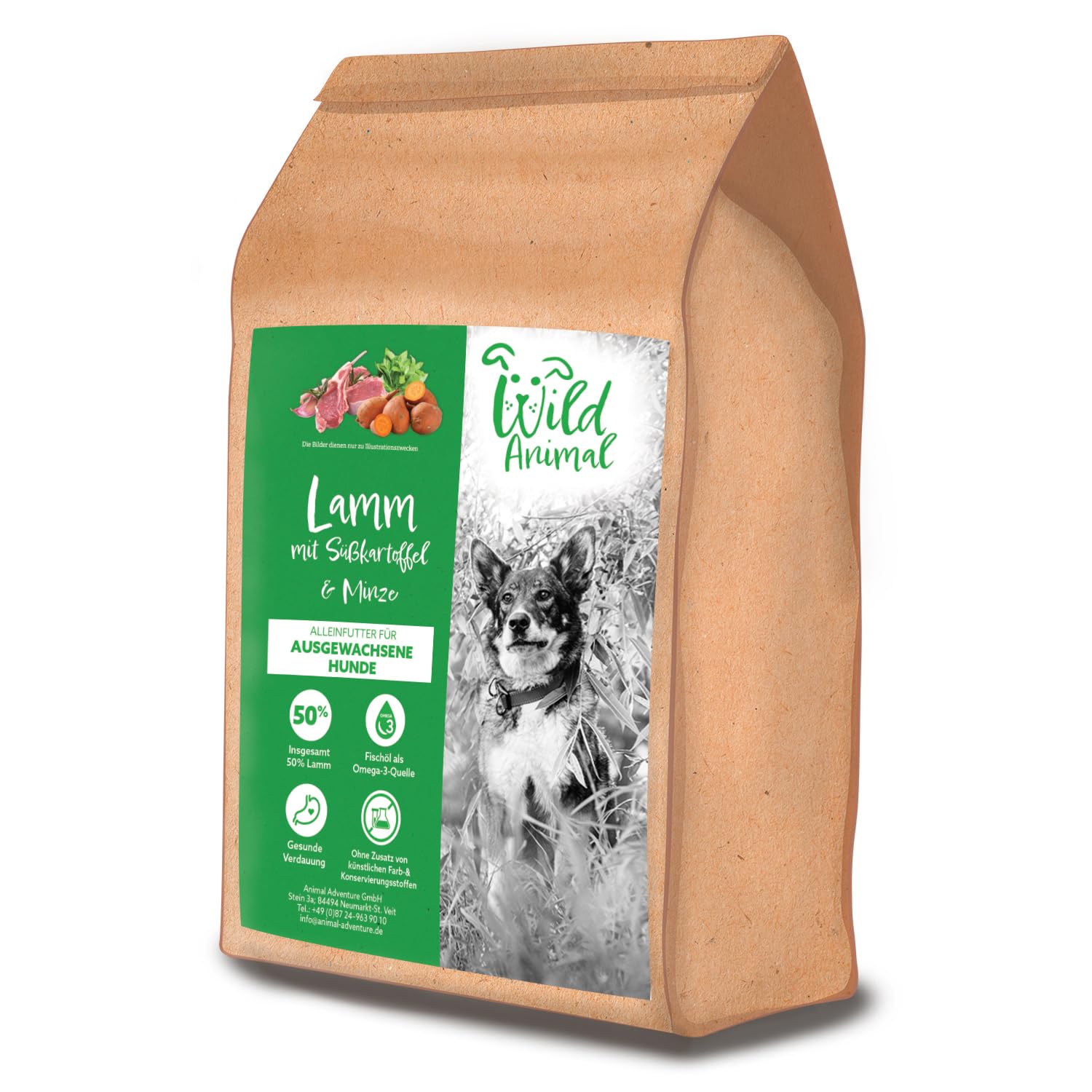 Green hills stretch out before your muzzle. Sitting high up, you observe the landscape. It's mild, and the wind ruffles your hair. You're hungry and you're already smelling your dinner. He is there, down there, grazing peacefully, and seems not to have noticed you. You then get up slowly and walk slowly down the hill. Your gaze turns to the right and suddenly you see him. The shepherd has noticed the runaway for a long time and brings him safely back to the flock. Yes, you should never sell the bear's skin before having killed it! Anyway, as long as there is Wild Animal in the bowl, everything is fine! Goodbye efforts, this way the pleasures of the palate! With a portion of lamb, garnished with sweet potato and mint, one thing is certain: the adventurers will be satisfied! Composition: lamb 50 (contains freshly prepared lamb 30 , dried lamb meat 18 and lamb stock 2 ), sweet potato (23 ), peas (9 ), potatoes, pea protein, flax seeds, beet pulp (overpressed), fish oil, minerals, mint (0.2 ), fructo-oligosaccharides (FOS, 96 mg kg), mannan-oligosaccharides (MOS, 24 mg kg) Analytical components: crude protein 26 , crude fat 13 , crude fiber 3 , crude ash 10 , moisture 8 , non-nitrogenous extracts 40 , omega 6 fatty acids 1.8 , omega 3 fatty acids 1.4 , calcium 2.0 , phosphorus 1.2 , energy metabolizable 360 kcal 100 g Vitamins: vitamin A 15,000 IU, vitamin D3 2,000 IU, vitamin E 95 IU Trace elements: zinc (zinc sulfate, monohydrate) 50 mg, iron (iron II sulfate, monohydrate) 50 mg, manganese (manganese sulfate, monohydrate) 35 mg, iodine (calcium iodate, anhydrous) 1 mg, selenium (sodium selenite) 0.3 mg INGREDIENTS Lamb 50 (contains freshly prepared lamb 30 , dried lamb 18 and lamb stock 2 ), sweet potato (23 ), peas (9 ), potatoes, pea protein, flaxseed, beet pulp (desweetened), fish oil, minerals, mint (0.2 ), fructooligosaccharides (FOS, 96 mg kg), mannanoligosaccharides (MOS, 24 mg kg) DIRECTIONS FOR USE 1-5 kg 25-90 g 5-10 kg 90-145 g 10-20 kg 145-250 g 20-30 kg 250-335 g 30-40 kg 335-415 g 40 kg 415 g All dogs are different. Therefore, the recommended average values must be adapted according to the dog's breed, age, temperament and level of physical activity. If changing food, please proceed gradually over a period of two weeks. Always make sure you have a bowl of clean, fresh water available. NO ARTIFICIAL COLORS OR PRESERVATIVES: With rosemary extract as a natural preservative. FISH OIL AS A SOURCE OF OMEGA 3: Contributes to healthy skin and coat. EASY DIGESTION: Prebiotics MOS and FOS contribute to a healthy intestinal flora and aid digestion. WHY LAMB? Lamb is not only a nutrient-rich and easily digestible source of protein, but also contains a high level of vitamin B12 and iron. Lamb also stimulates blood cell formation and contributes to a healthy nervous system. WILD ANIMAL: We serve your best friends much more than just "food," we serve them nature in its purest form. How? Quite simply! We take the best that forests and meadows have to offer and combine it with carefully selected natural ingredients to concoct, in our natural factory, a prey worthy of the greatest adventurers. What is banned? Grains and artificial additives of course! NO ARTIFICIAL COLORS OR PRESERVATIVES: With rosemary extract as a natural preservative. FISH OIL AS A SOURCE OF OMEGA 3: Contributes to healthy skin and coat. EASY DIGESTION: Prebiotics MOS and FOS contribute to a healthy intestinal flora and aid digestion. WHY LAMB? Lamb is not only a nutrient-rich and easily digestible source of protein, but also contains a high level of vitamin B12 and iron. Furthermore, lamb stimulates the formation of blood cells and contributes to the health of the nervous system. WILD ANIMAL: We serve your best friends much more than "food", we serve them nature in its purest form. How? Quite simply! We take the best that forests and meadows have to offer and combine it with natural ingredients, carefully selected, to concoct, in our natural factory, a prey worthy of the greatest adventurers. What is banned? Grains and artificial additives of course! Des collines verdoyantes s'étendent devant ton museau. Assis en hauteur, tu observes le paysage. Il fait doux, et le vent vient ébouriffer tes poils. Tu as faim et tu flaires déjà ton dîner. Il est là, en bas, en train de brouter paisiblement, et semble ne pas t'avoir remarqué. Tu te lèves alors doucement et descends la colline à pas de loup. Ton regard se tourne vers la droite et soudain, tu le vois. Le berger a remarqué le fugueur depuis longtemps et le ramène en sécurité jusqu'au troupeau. Eh oui, il ne faut jamais vendre la peau de l'ours avant de l'avoir tué ! Enfin bon, tant qu'il y a Wild Animal dans la gamelle, tout va bien ! Adieu les efforts, par ici les plaisirs du palais ! Avec une ration d'agneau, agrémentée de patate douce et de menthe, une chose est sûre : rassasiés seront les aventuriers ! Composition: agneau 50 (contient agneau fraîchement préparé 30 , viande d'agneau séchée 18 et bouillon d'agneau 2 ), patate douce (23 ), pois (9 ), pommes de terre, protéine de pois, graines de lin, pulpes de betteraves (surpressées), huile de poisson, minéraux, menthe (0,2 ), fructo-oligosaccharides (FOS, 96 mg kg), mannane-oligosaccharides (MOS, 24 mg kg) Composants analytiques: protéines brutes 26 , matières grasses brutes 13 , fibres brutes 3 , cendres brutes 10 , humidité 8 , extraits non azotés 40 , acides gras oméga 6 1,8 , acides gras oméga 3 1,4 , calcium 2,0 , phosphore 1,2 , énergie métabolisable 360 kcal 100 g Vitamines: vitamine A 15.000 UI, vitamine D3 2.000 UI, vitamine E 95 UI Oligoéléments: zinc (sulfate de zinc, monohydrate) 50 mg, fer (sulfate de fer II, monohydrate) 50 mg, manganèse (sulfate de manganèse, monohydrate) 35 mg, iode (iodate de calcium, anhydre) 1 mg, sélénium (sélénite de sodium) 0,3 mg INGRÉDIENTS Agneau 50 (contient de l'agneau fraîchement préparé 30 , de l'agneau séché 18 et du bouillon d'agn