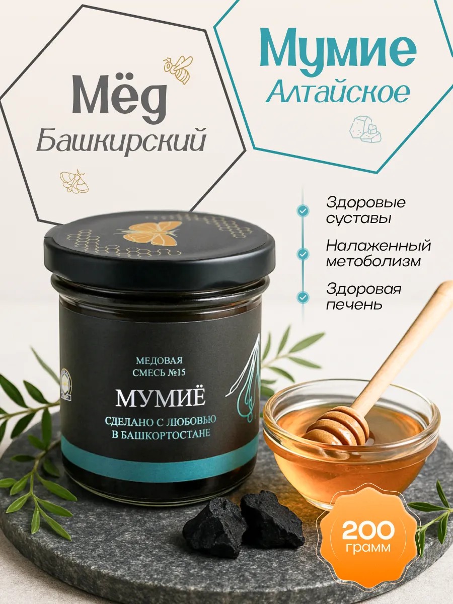 The mixture includes Bashkir honey from our own apiaries and Altai natural mountain mumiyo.