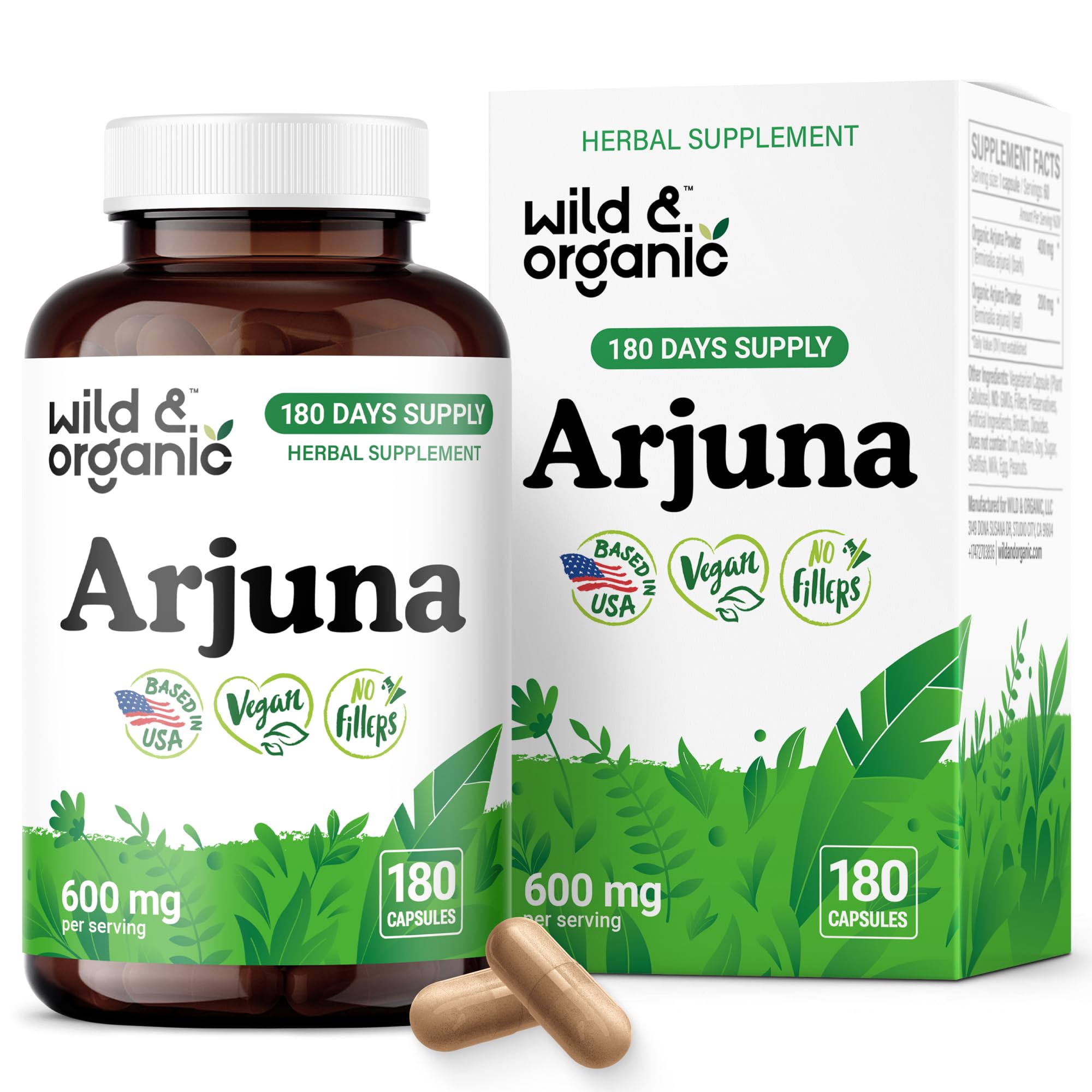 Wild & Organic Arjuna Bark Capsules - Overall Support - Arjuna Powder Supplement - 180 Herbal Capsules - 6-Month Supply - Terminalia Bark & Leaf Extract - Vegan No Fillers Non-GMO 180 Count (Pack of 1)