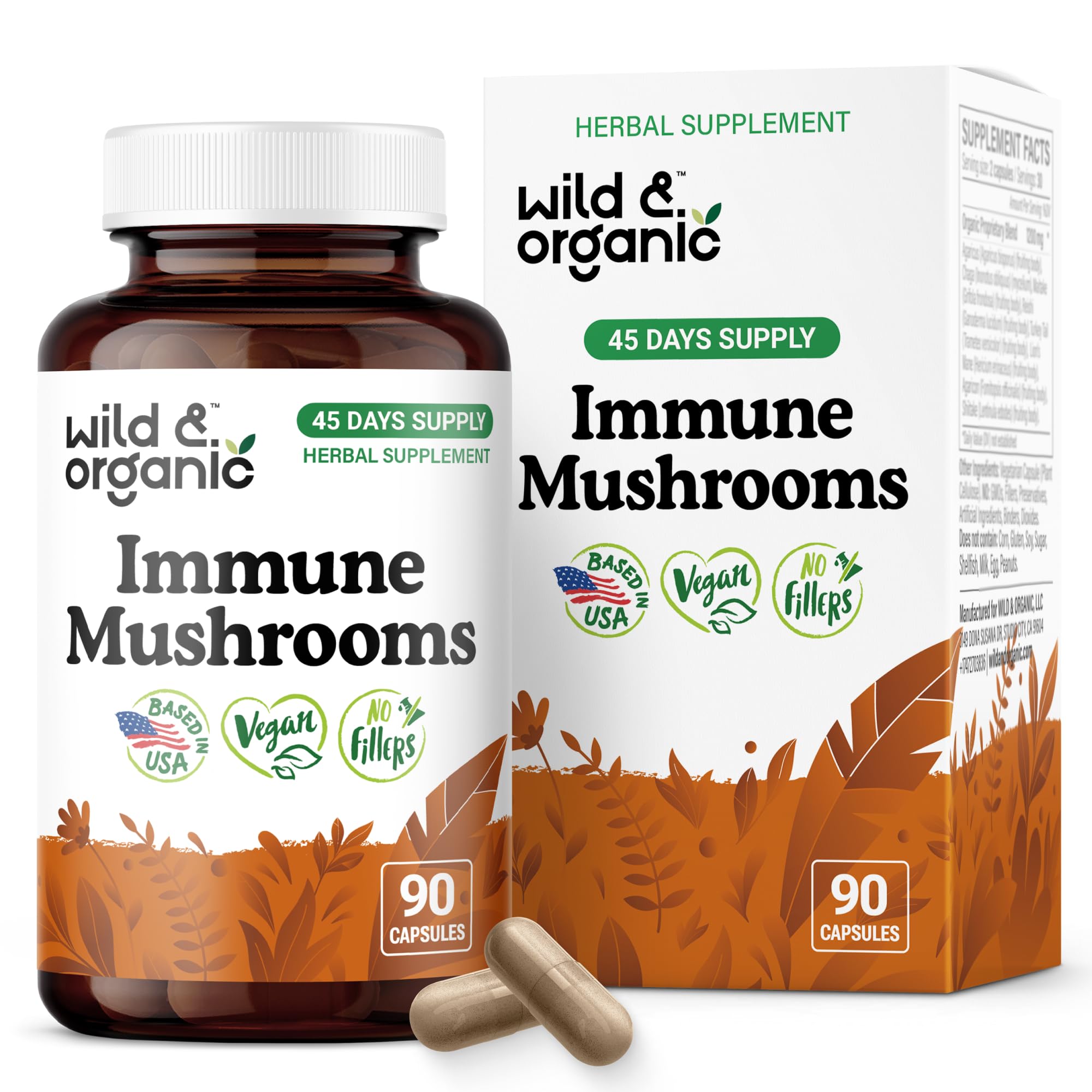 Wild & Organic Immune Mushroom Complex Capsules - 8 Mushroom Blend Supplements for Immunity Support with Turkey Tail Chaga & Reishi Powder - 45 Days Supply - Vegan No Fillers Non-GMO - 90 Count 90 Count (Pack of 1)