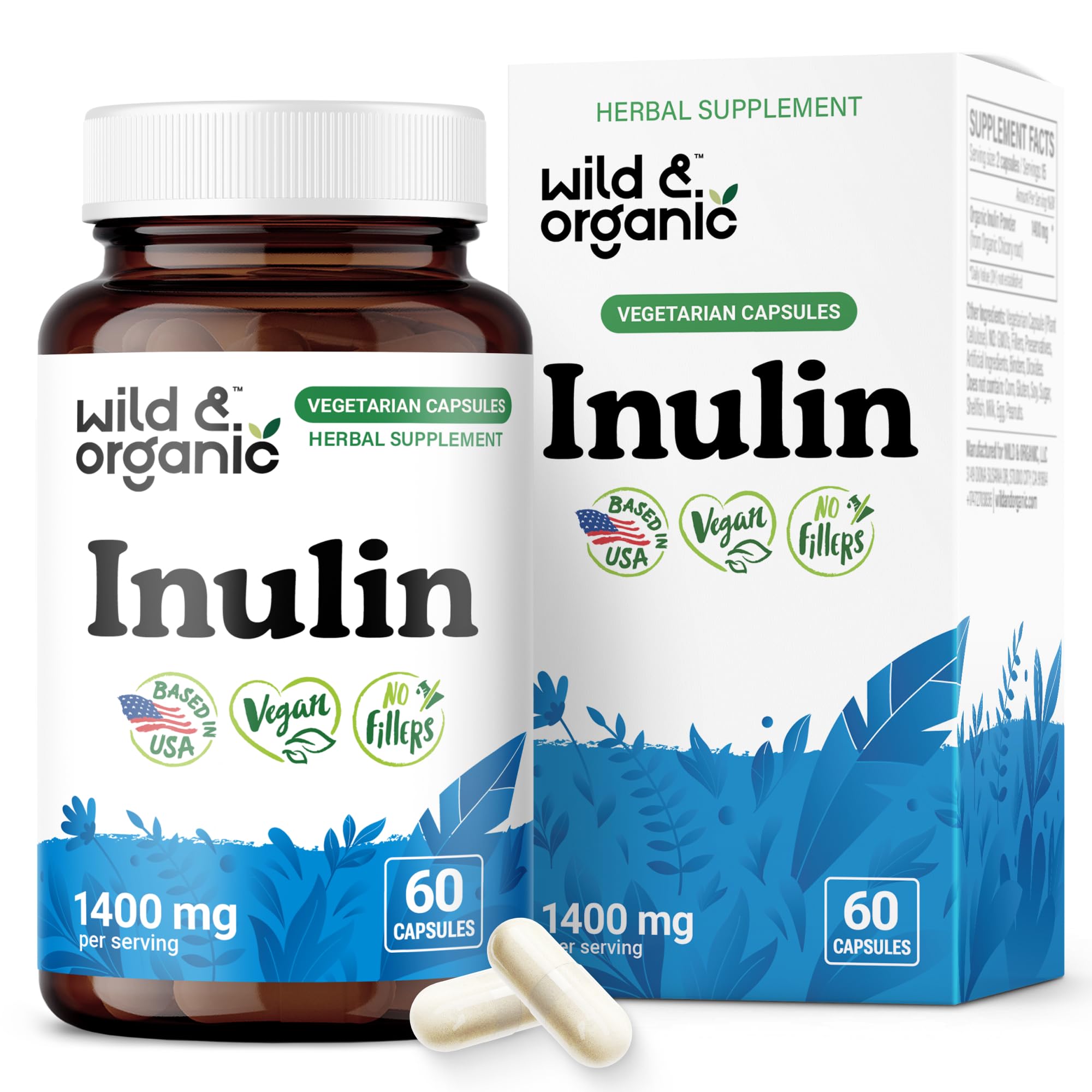 15-Day Supply: Each bottle of Wild Organic inulin supplements contains 60 prebiotic inulin from chicory root capsules, providing a 15-day supply when taking two capsules two times per day. Easy-to-Take: Enjoy a pleasant supplement experience with our chicory inulin capsules, featuring a smooth and easy-to-take design. Plant-Based: Wild Organic pure inulin fiber supplement uses plant-based ingredients, including a vegetable cellulose coating, making it suitable for vegans. Natural Formula: Wild Organic inulin powder capsules are made with vegan ingredients, free from GMOs, and contain no artificial additives and fillers. Digestive Gut Support: Each serving of Wild Organic inulin prebiotic fiber capsules contains 1400 mg of chicory root inulin powder for digestive and gut support.