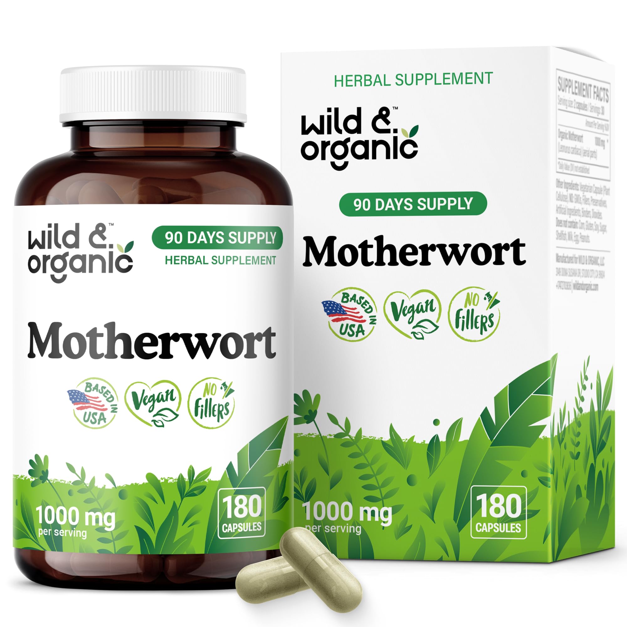90-Day Supply: Each bottle of Wild Organic mother wort contains 180 motherwort powder capsules, providing a 90-day supply when taking two capsules once per day. Easy-to-Take: Enjoy a pleasant supplement experience with Wild Organic motherwort extract, featuring a smooth and easy-to-take design. Plant-Based: Wild Organic motherwort supplement uses plant-based ingredients, including a vegetable cellulose coating, making it suitable for vegans. Natural Formula: Our herbal capsules are made with vegan ingredients, free from GMOs, and contain no artificial additives and fillers. Calmness and Women's Support: Each serving of Wild Organic motherwort capsules contains 1000 mg of motherwort herb for women's and calmness support.