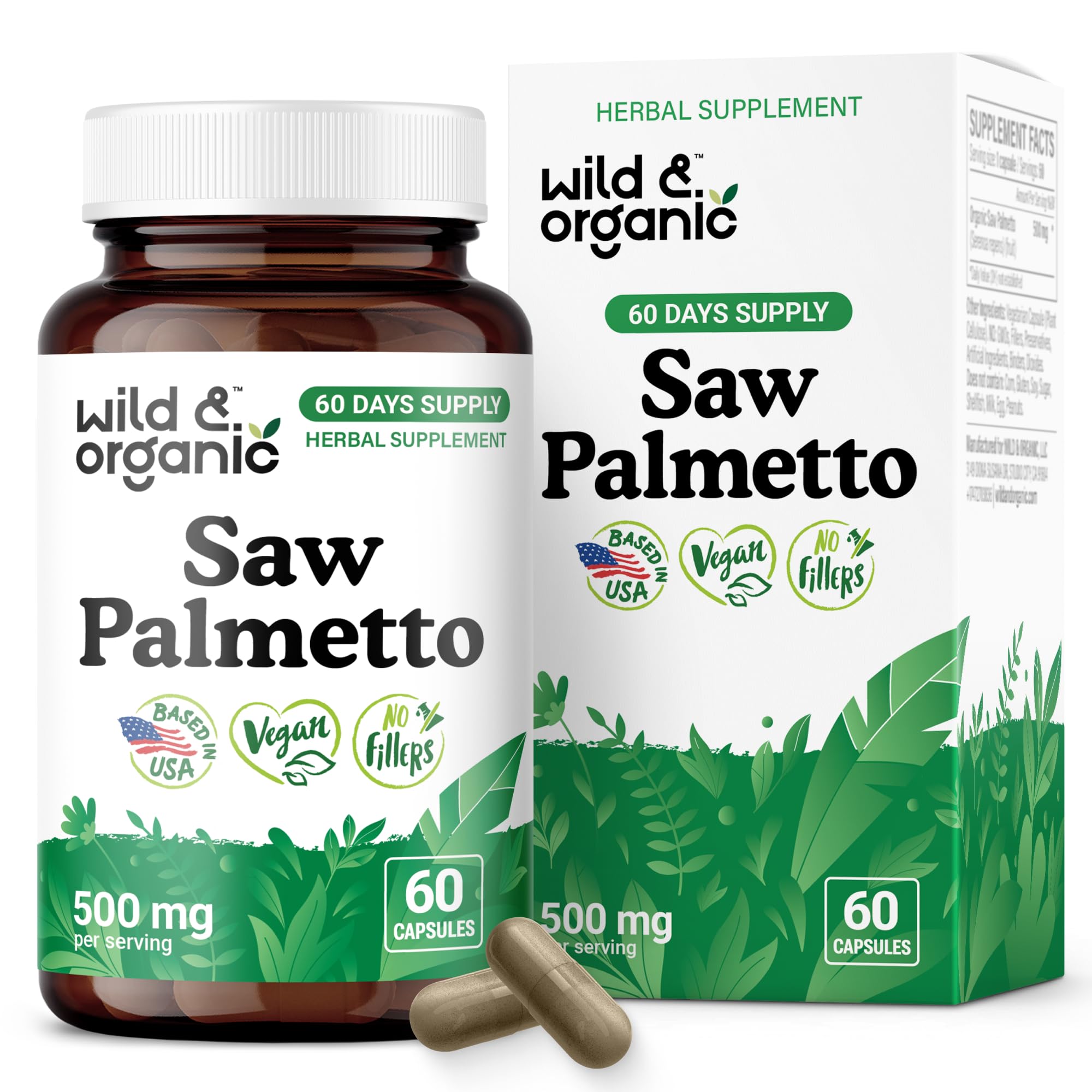 Wild & Organic Saw Palmetto Capsules 500 mg - Urinary Tract Support for Men & Women - Pure Saw Palmetto Powder Supplement - Serenoa Repens Berries - 60 Days of Supply - Vegan Non-GMO - 60 Count 60 Count (Pack of 1)