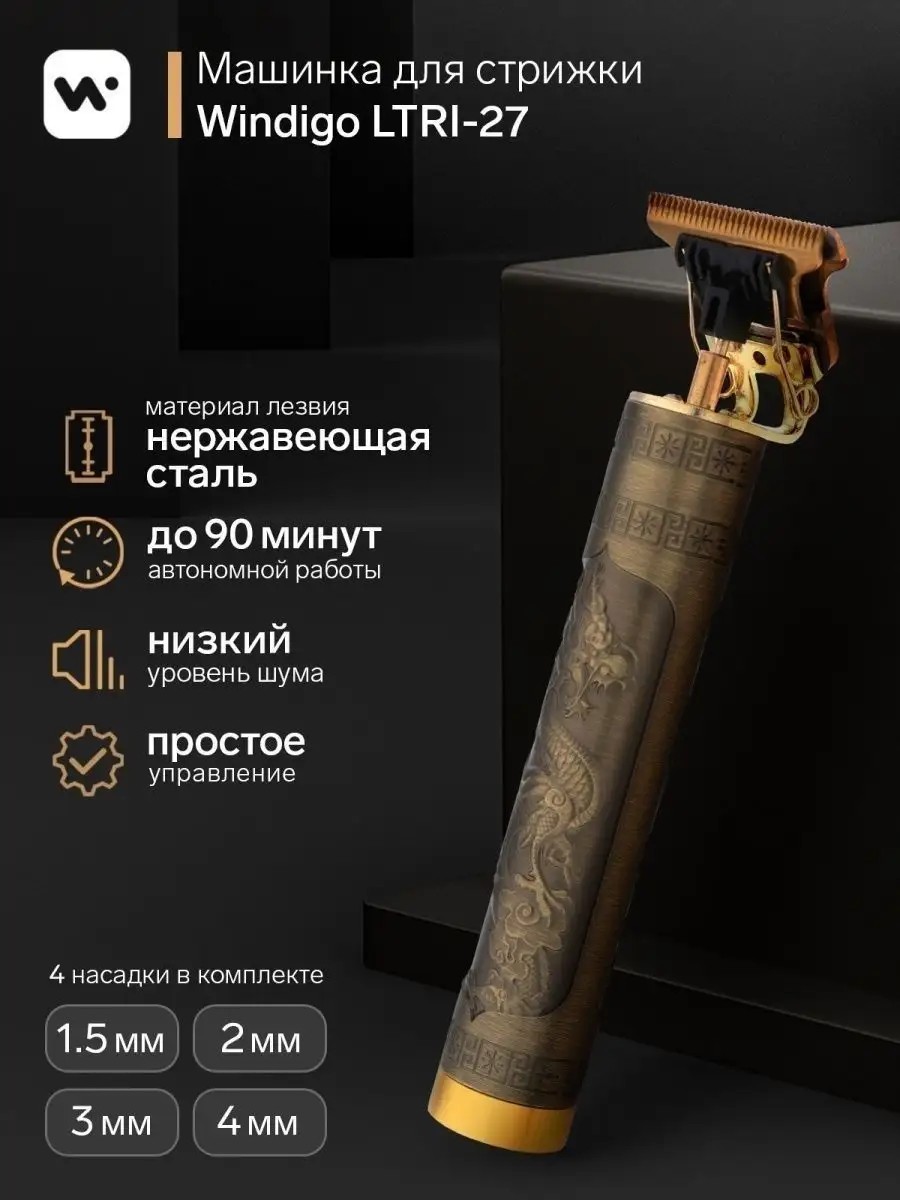 Машинка для стрижки Windigo LTRI-27, портативная, 2500 мАч, 4 насадки, "Дракон". Машинка для стрижки Windigo LTRI-27 подходит для домашнего использования. Компактным инструментом просто и удобно работать. Имеет 5 вариантов установки длины. Работает батарейки-аккумулятора.