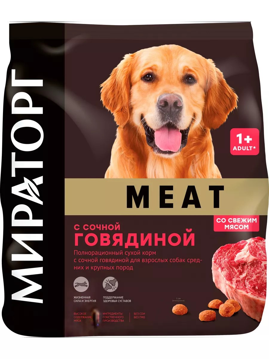 Корм Мираторг Meat для собак средних и крупных пород, с говядиной, 10 кг. ПОЛНОРАЦИОННЫЙ СУХОЙ КОРМ WINNER MEAT С ГОВЯДИНОЙ ДЛЯ ВЗРОСЛЫХ СОБАК СРЕДНИХ И КРУПНЫХ ПОРОД Сухой корм Без сои и ГМО. Высокое содержание мяса и оптимальное содержание белка обеспечивают питомца полноценным набором аминокислот. Жизненная сила и энергия. Корм помогает сохранить и укрепить здоровье собаки благодаря высокому содержанию мяса и полезных нутриентов. Активные компоненты: Cочетание витаминов группы В и пребиотиков для правильной работы желудочно - кишечного тракта. Полноценный комплекс незаменимых аминокислот обеспечит питомца энергией для активной жизни. Комплекс витаминов А и Е для повышения защитных сил организма 4. сочетание Омега 6 и цинка для здоровой кожи и блестящей шерсти питомца. Здоровые зубы и десны: Баланс минералов и хрустящие крокеты помогают снятию мягкого зубного налета и поддерживают здоровье зубов и десен питомца.
