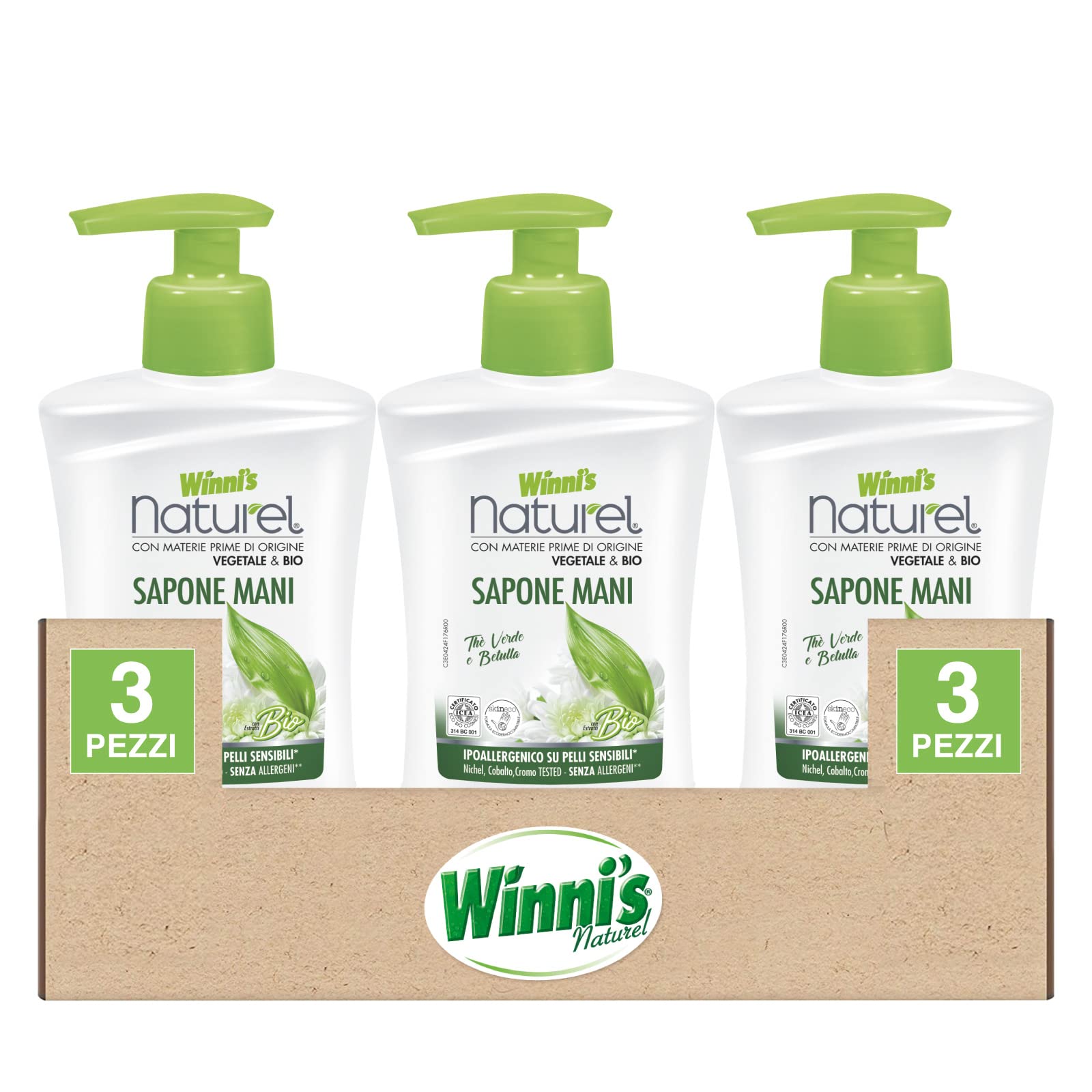 Winni's Natural Organic Hand Soap is a cleanser for sensitive skin that guarantees hygiene, softness, and skin elasticity. Hypoallergenic and skin-friendly, this soap ensures excellent skin tolerance. Its disinfectant formula is enriched with organic plant extracts of green tea, birch, and aloe vera, which guarantee a fresh scent. Pour a dose onto wet hands, rub until a rich lather forms, and rinse.Pour a dose onto wet hands, rub until a rich lather forms, and rinse. This disinfectant formula is enriched with organic and plant extracts of green tea, birch, and aloe vera, guaranteeing a fresh scent. Hypoallergenic and skin-friendly, this soap ensures excellent skin tolerance. A cleanser for sensitive skin that guarantees hygiene, softness, and elasticity. The kit contains: 3 bottles of Winni's Natural Organic Hand Soap, 250 ml each.Winni's Naturel Savon Mains Bio Hypoallergénique pour Peaux Sensibles, Nettoyant pour Hygiène Douceur de la Peau Dermocompatible Parfum Thé Vert et Bouleau - 3 Flacons de 250 mlDESCRIPTION DU PRODUIT Winni's Naturel Savon Mains Bio est un nettoyant pour peaux sensibles qui garantit hygiène, douceur et élasticité de la peau. Hypoallergénique et dermocompatible, ce savon assure une extrême tolérance cutanée. Sa formule désinfectante est enrichie en extraits biologiques et végétaux de thé vert, de bouleau et d'aloe vera qui garantissent un parfum frais. Verser une dose sur les mains humides, frictionner jusqu'à obtenir une mousse abondante et rincer.Verser une dose sur les mains humides, frictionner jusqu'à obtenir une mousse abondante et rincer. Formule désinfectante enrichie en extraits biologiques et végétaux de thé vert, bouleau et aloe vera qui garantissent un parfum frais. Hypoallergénique et dermocompatible, ce savon assure une extrême tolérance cutanée. Nettoyant pour peaux sensibles qui garantit hygiène, douceur et élasticité de la peau. Le kit contient : 3 flacons de nettoyant Winni's Naturel Savon mains bio de 250 ml chacun.