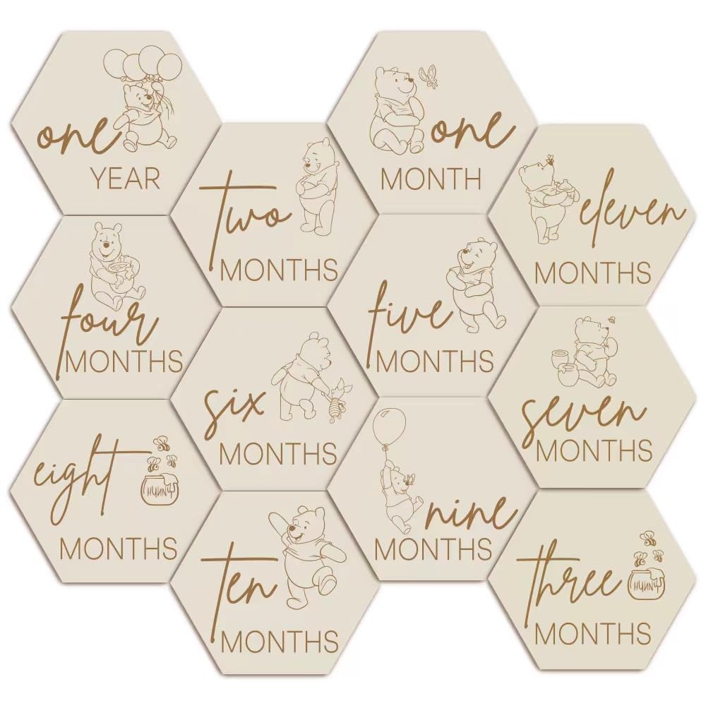 Winnie Baby Announcement Sign Newborn Sign Wooden Hexagon Announcement Sign For Photo Prop Baby Shower Nursery Gift(12PCS)