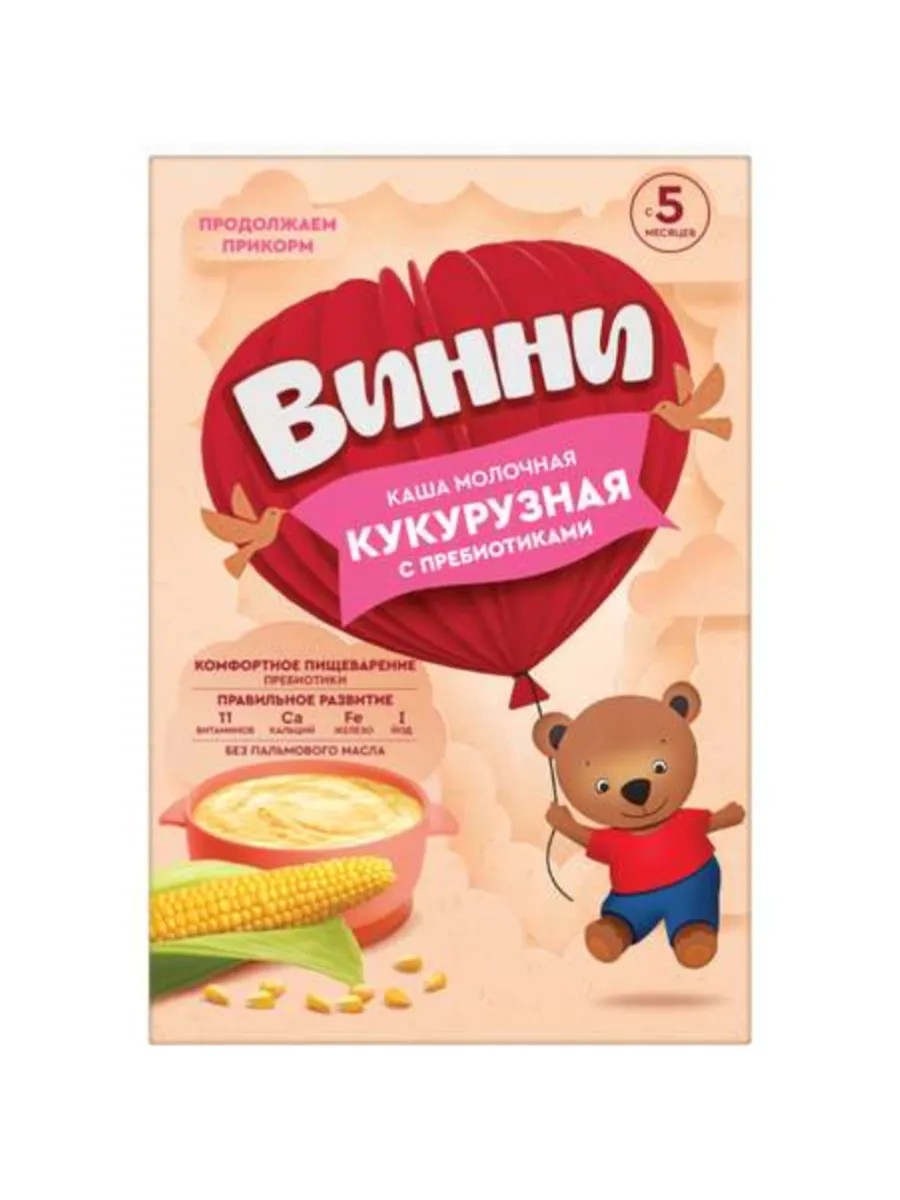 Молочная кукурузная каша для детей с 5 месяцев с пребиотиками без добавления пальмового и других растительных масел не содержит ГМО не содержит красителей и консервантов без соли расфасована в специальных условиях обеспечивающих сохранность витаминов и минеральных веществ.