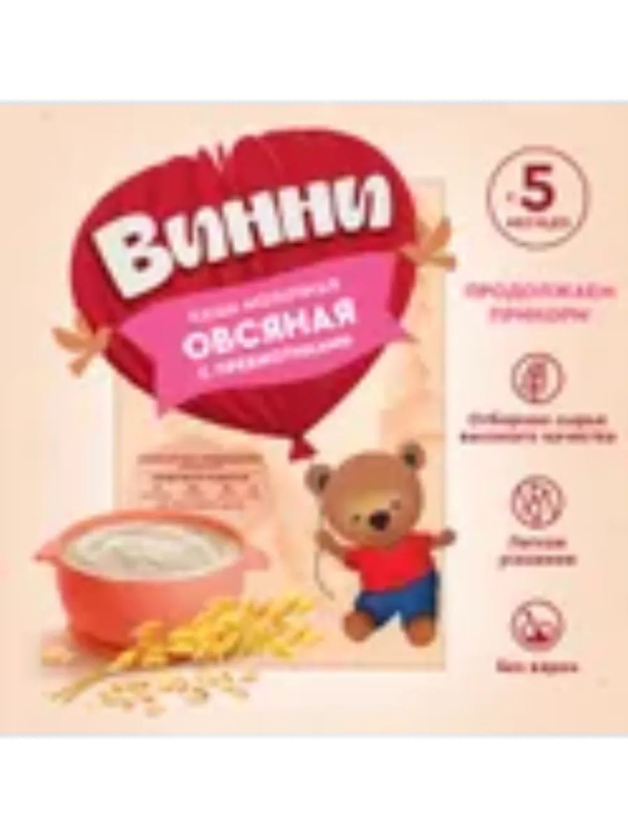 Молочная овсяная каша для детей с 5 месяцев с пребиотиками без добавления пальмового и других растительных масел не содержит ГМО не содержит красителей и консервантов без соли расфасована в специальных условиях обеспечивающих сохранность витаминов и минеральных веществ.