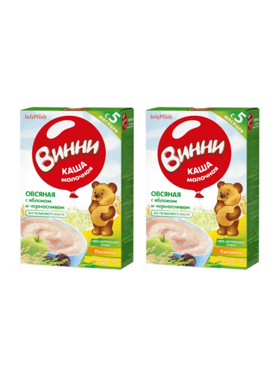 Винни, Каша сухая молочная Овсяная с яблоком и черносливом, с пребиотиками для детей с 5 месяцев 200 гр., комплект из 2 шт. Молочная Овсяная каша с яблоком и черносливом познакомит малыша старше 5 месяцев с новыми сочетаниями злака и фруктов. Сбалансированный составбез добавления пальмового и других растительных маселне содержит ГМОне содержит красителей и консервантовбез солирасфасована в специальных условиях, обеспечивающих сохранность витаминов и минеральных веществВажные ингредиенты для роста и развития100% натуральные злаки являются источником углеводов, растительного белка и пищевых волокон. Цельное молоко повышает питательную ценность каши, являясь источником высококачественного молочного белка и витаминов.11 витаминов способствуют гармоничному росту и развитию ребенка. Кальций необходим для формирования костей и зубов. Железо обеспечивает профилактику железодефицитной анемии. Йод способствует интеллектуальному развитию малыша.