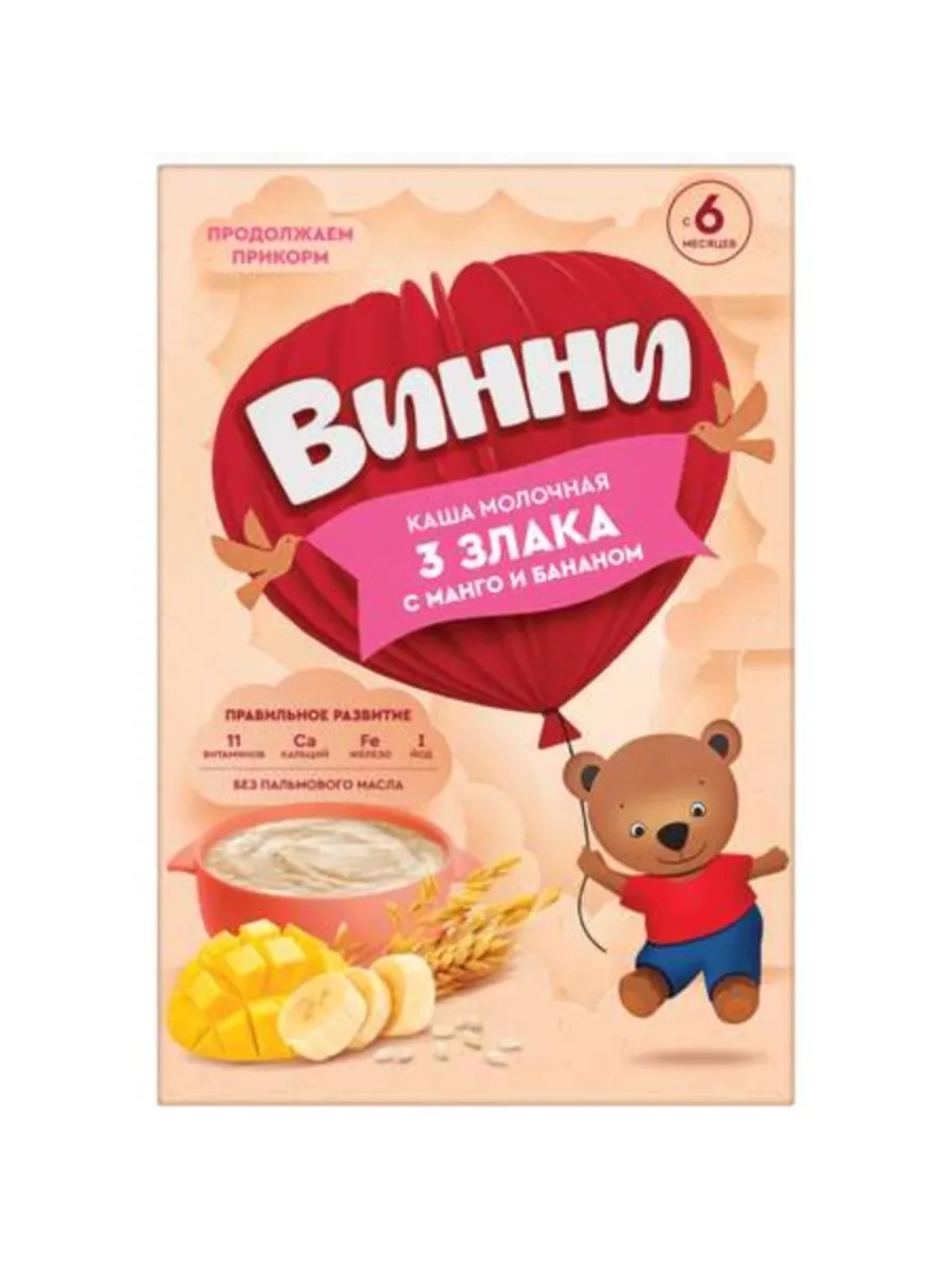 Milk porridge with three grains, mango, and banana, for children 6 months and older, without added palm oil or other vegetable oils. Non-GMO, no artificial colors or preservatives, no salt, packaged under special conditions to ensure the preservation of vitamins and minerals.