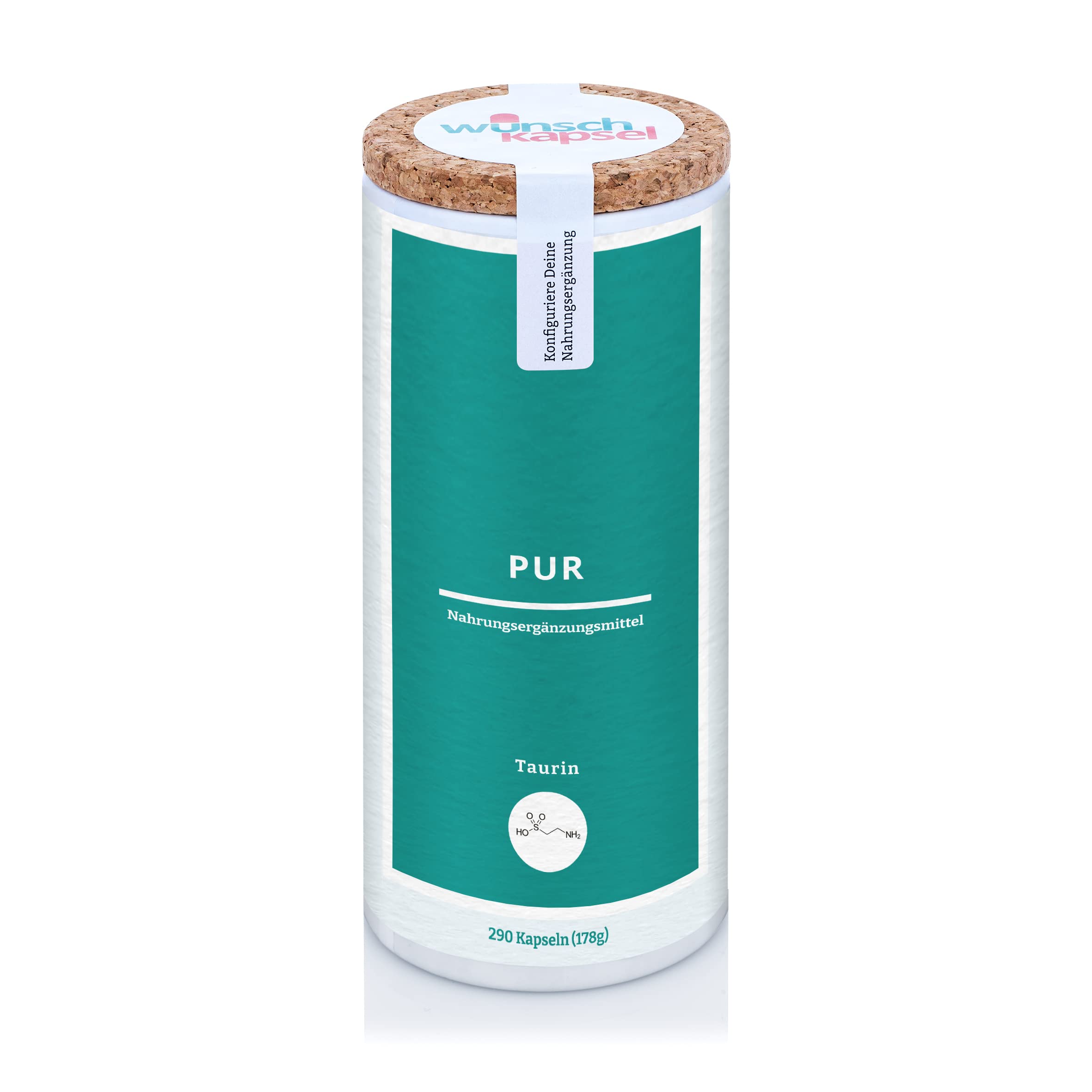 Ökologische, nachhaltige und plastikfreie Verpackung aus Pappe (Altpapier) mit Korkdeckel (Wiederverwendbar). Jedes Produkt wird auf Deine Bestellung hin hergestellt und hat ein MHD von 6 Monaten. Vegane HPMC-BIO-Kapseln, von Hand hergestellt in unserer deutschen Wunschkapsel-Manufaktur, vegan, frei von tierischen Zusatzstoffen oder Gluten. Sie enthalten keine unerwünschten Zusätze wie z.B. Farbstoffe, Aromen, Konservierungsstoffe, Trennmittel oder Gelatine. Dosierung pro Tag: 750 mg, das entspricht 2 Kapseln. XXL Reichweite bei Daueranwendung von 145 Tagen!. Taurin ist ein natürlicher Amino-Boost für Konzentration, Herz und Energie. Unsere PUR-Nahrungsergänzungen enthalten nur einen Inhaltsstoff höchster Qualität und Ballaststoffe als Füllmittel.