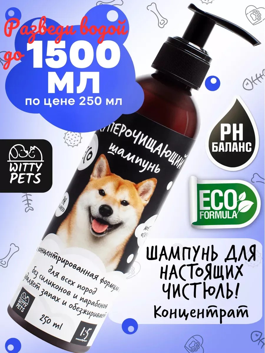 Концентрированный суперочищающий шампунь Witty pets для собак всех пород (применяется в разбавленном виде 1 к 5). Благодаря сбалансированному составу очищает кожу и шерсть "до скрипа" не изменяя ее структуры, прекрасно обезжиривает, подходит для профессионального использования в груминг салонах.