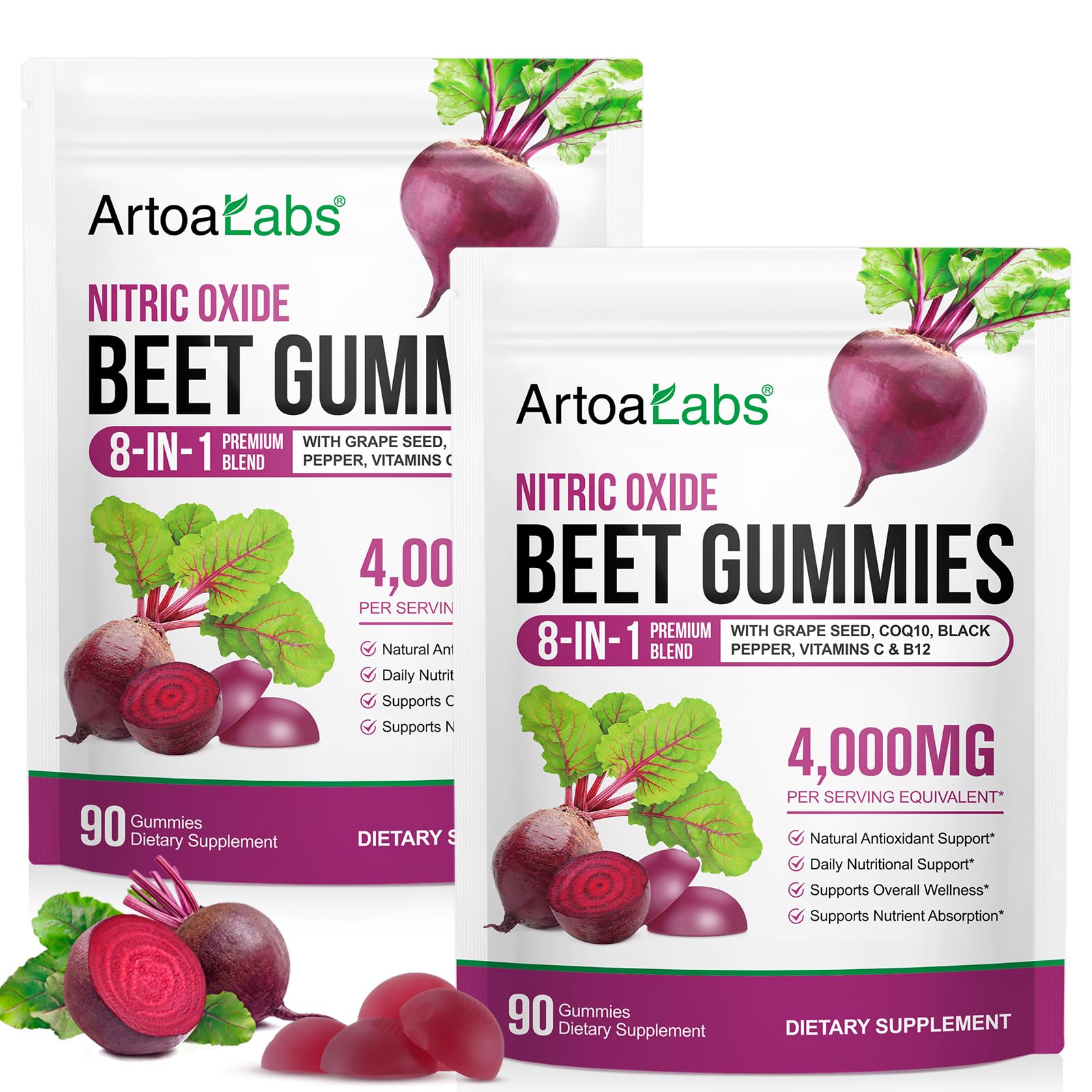 45-day supply 90 Beet Heart Gummies:Each pouch contains 90 gummies (2 gummies per daily serving), delivering exceptional value and convenience for your daily wellness routine. Convenient Delicious: Beets Heart Health Soft Chews are absolutely delicious and full of sweet and fruity flavor you'll love. They're individually wrapped for convenience and easy to chew ,provides you with a simple and tasty way to enjoy the benefits of beets without the bitter beet aftertaste!. Supports Improved Circulation Blood Flow: With every daily dose of this potent nitric oxide supplement, you can count on enhanced blood flow to promote optimal circulation, delivering oxygen and nutrients to your heart, and every cell in your body. The Power Super Beetroot Gummies:Beets are naturally rich in nitrates with multiple heart health benefits. Grape seed extract helps maintain energy levels, while CoQ10 acts as a powerful support, Beetroot Gummies Support Nitric Oxide Generation. 4-IN-1 Heart Health Formula With CoQ10: Every delicious soft chew contains a clinically powerful blend of beetroot powder, grapeseed extract, CoQ10, and B Vitamins to support heart function, blood pressure, circulation, cellular energy, and more,are a powerful beetroot supplement.
