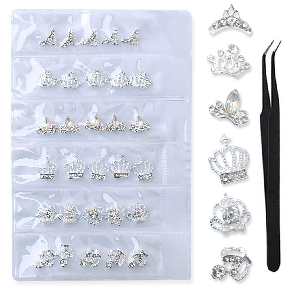 WOKOTO 30 Pcs 3D Alloy Crown Nail Charms For Nail Art 3D Decoration Set Silver Crown Nail Studs Rhinestones Clear Crystals Manicure Jewelry With 1pc Tweezers For Actylic Nails KIT1
