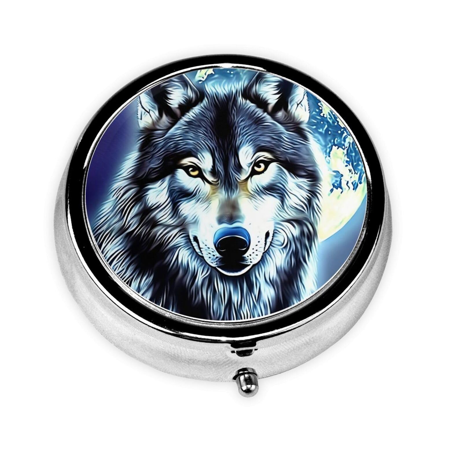 Wide range of applicable scenarios: suitable for use in various occasions such as home, office, and travel, providing you with convenient drug storage solutions. Multi-grid plastic inserts: The medicine box is designed with 3 plastic inserts inside, which can separate and store different types of pills, making them more organized and convenient to use. Convenient opening button design: The medicine box button design is easy to open, convenient and fast, and simple to operate, allowing you to easily access the medicine. Environmentally friendly metal material: Made of environmentally friendly metal iron plating material, it is durable, safe and reliable, and protects medicines from damage. Wolf under moon Portable mini design: round mini pill box, measuring 2.0x2.0x0.7 inches, lightweight and portable, suitable for carrying in pockets and purses, providing you with urgently needed medicines anytime and anywhere.