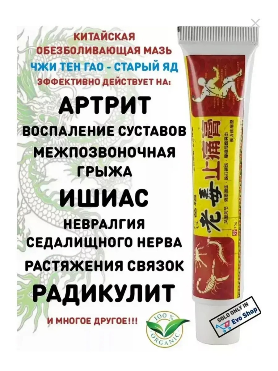Мазь для суставов от боли и артрита. Китайская традиционная чудо мазь. Чжи Тен Гао. Крем можно использовать, как обезболивающее средство от любых болей, воспалений и даже радикулита. Эффективен при таких, заболеваниях как ревматоидный артрит и воспаление суставов. Различных травмах. Также справляется с мышечной болью после силовых тренировок, ревматизмом, невралгией седалищного нерва и другими воспалениями. Обладает легким, но в тоже время глубоким прогревающим эффектом, который после первых применений оказывает воздействие на любых этапах развития болезней. Убирает повреждения от ударов и ушибов. Король кожи воздействует именно на причину, а не на симптомы, тем самым полностью останавливает воспалительные процессы. Дерматологи рекомендуют применять, как для лица, при склонности к обильным высыпаниям. При сухой коже. Для тела на определенные участки, где шелушения. Для головы от перхоти. Она включает в себя активные компоненты – падубовое масло, черный муравей, борнеол, хлоргексидин. Чудо-мазь превосходит по эффективности любую корейскую, тайскую и русскую косметику. Плотная текстура, хорошо впитывается и не оставляет следов на одежде. Достаточно наносить на пораженные места тонким слоем 3 - 4 раза в день. Но есть противопоказание - это индивидуальная непереносимость компонентов.