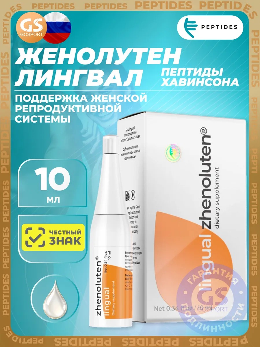 Годен до 31.03.2028. Женолутен (Zhenoluten) лингвал 10 мл. Натуральные пептиды яичников - ЖенолутенЖенолутен - комплекс пептидов, полученных из яичников. Выделенные пептиды обладают избирательным действием на клетки яичников, регулируют процессы метаболизма в яичниках, способствуют созреванию яйцеклеток, восстанавливают циклическую деятельность яичников.При клиническом изучении установлена эффективность Женолутен для комплексного восстановления функции женской репродуктивной системы при патологических состояниях различного генеза, в том числе при гипофункции яичников, нарушении менструального цикла, климактерических расстройствах, женском бесплодии, обусловленном нарушениями гормонального статуса, а также для женщин старших возрастных групп для оптимизации функции половой системы.Пептиды яичников вырабатываются в раннем возрасте, но по мере взросления и увеличения нагрузок на человеческий организм активность синтеза белка падает, а в результате недостаточности пептидов нарушается функционал клеток яичников. Сегодня противостоять дефициту пептидов яичников можно за счет приема препарата Женолутен, на основе пептидов ткани яичников млекопитающих животных, тем самым восполняя пул регуляторных пептидов, которые вырабатываются яичниками. Основные действия Женолутена N60: оптимизация функции яичников; снижение атрофии яичников; снижение риска развития патологий в яичниках.Препарат Женолутен рекомендован при: нарушении работы яичников; сбоях менструального цикла; эндометриозе; женском бесплодии; климактерических расстройствах; заболеваниях репродуктивной системы, зависимых от гормонов; снижении либидо.Женолутен отлично показал себя в отношении оптимизации функционирования половой системы женщин старшего возраста, при этом побочных действий выявлено не было. Для лечения возрастных заболеваний яичников рекомендуется применение Женолутена в сочетании с другими препаратами.Состав продуктаПептидный комплекс А-15 (пептиды яичников), носитель МКЦ; оболочка капсулы (гидроксипропилметилцеллюлоза, вода очищенная, каррагинан, ацетат калия); антислеживающий агент кальциевая соль стеариновой кислоты.Женолутен лингвал: вода, пептидный комплекс А-15 (экстракт яичников молодых животных не старше 12-месячного возраста).Суточная доза содержит: (2 капсулы), 20 мг пептидного комплекса А-15. Способ примененияВзрослым по 1-2 капсулы 1-2 раза в день во время еды. Продолжительность приема - 1 месяц.Женолутен лингвал: взрослым рекомендуется принимать под язык за 10–15 минут до еды по 5–6 капель (0,25–0,35 мл) 3–4 раза в день. Продолжительность приема — 1 месяц. Рекомендуется проводить повторный прием через 3–6 месяцев.
