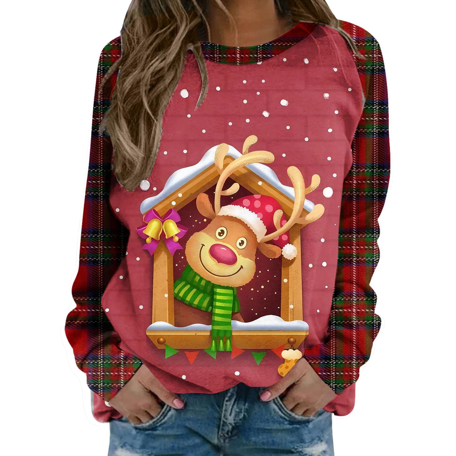 Women's Christmas Sweatshirts Cute Snowman Penguin Print O-Neck Raglan Top Shirt Pullover Comfy Warm Xmas Jumper Winter Long Sleeve Tops Loose Tunic Top Sweaters Watermelon Red S