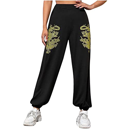 Women's Dragon Print Sweatpants High Waisted Joggers Baggy Pants Workout Running Lounge Trousers with Pockets 01 Black Large