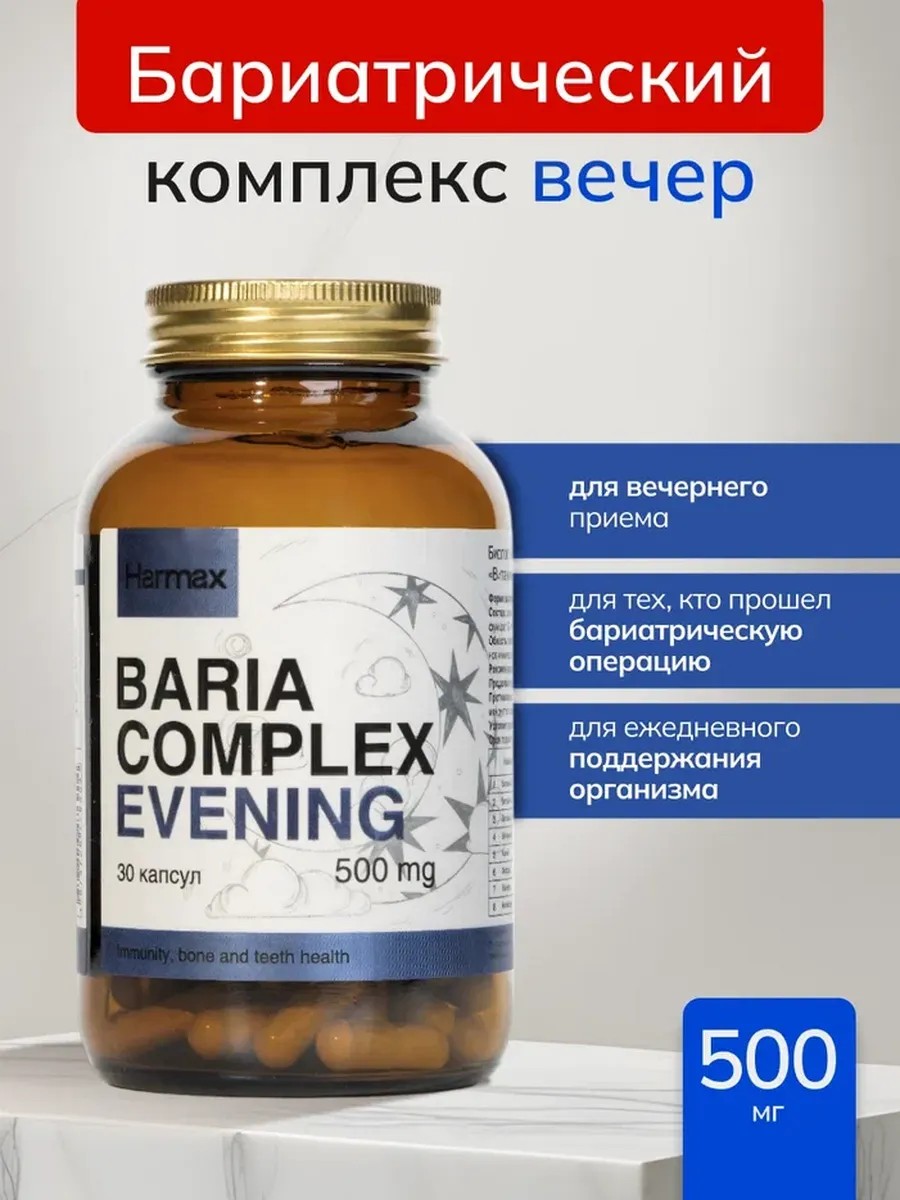 Harmax Baria Complex Everning (вечер) - это витаминно-минеральный комплекс для пациентов после различных модификаций гастрошунтирования. Разделение суточной дозы на утренний и вечерний прием позволяет учесть взаимодействие между компонентами витаминно-минерального комплекса, обеспечивая оптимальное воздействие на организм.