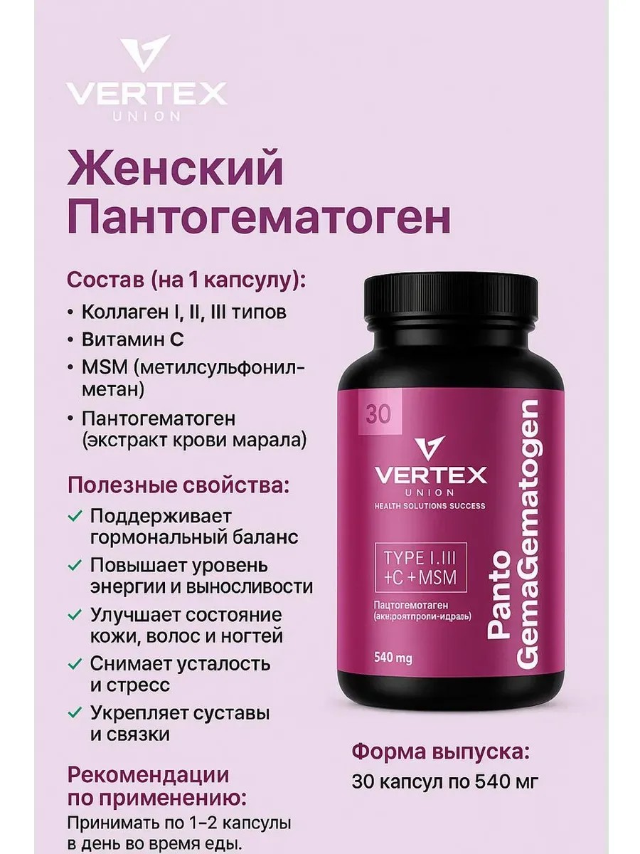 Женский Пантогематоген от VERTEX UNION — это уникальная биологически активная добавка, разработанная специально для женщин, заботящихся о здоровье кожи, волос, ногтей и суставов. Содержит коллагены I, II, III типов, витамин C, MSM и пантогематоген — природный стимулятор женской энергии и выносливости.