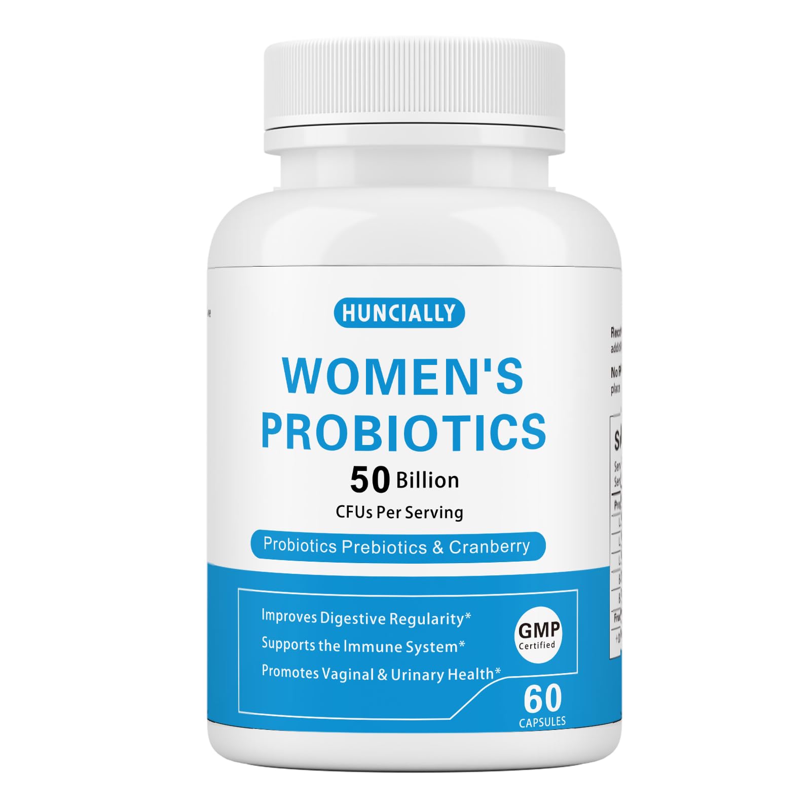 High-Quality Assurance: This product is produced in a GMP certified factory and meets the product's high-quality standards, ensuring premium quality and safety for every capsule. Clean Safe Formula: Made with non-GMO ingredients, free from artificial additives, and gluten-free, this probiotic is safe for daily use and suitable for women with dietary restrictions. Promotes Vaginal Urinary Health: Enriched with cranberry, this supplement helps maintain a balanced vaginal pH and reduces the risk of urinary tract infections, making it ideal for women's intimate health. Supports the Immune System: This probiotic blend strengthens your immune defenses by enhancing gut health, which is directly linked to 70-80 of your body's immune response. Improves Digestive Regularity: Formulated with 50 Billion CFUs of probiotics and prebiotics, HUNCIALLY Women's Probiotic promotes a healthy gut microbiome, aiding in better digestion and reducing bloating and discomfort.