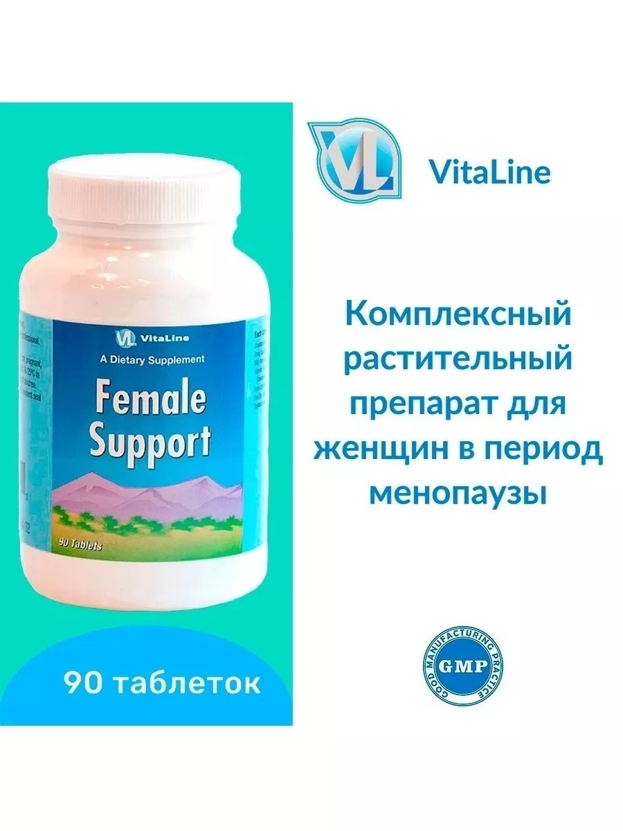 Female Support Vitaline is a complex herbal preparation for women during menopause. EFFECT ON THE BODY: a source of flavonoids (including isoflavones), arbutin and phytosterols, contains saponins; due to phytoestrogens contained in Chinese angelica, black cohosh, bearberry, it has an effect similar to the female hormone estrogen, which normalizes hormonal balance and prevents the development of osteoporosis; due to the action of hairy dioscorea and chasteberry fruits, it stimulates the production of the female hormone of the 2nd phase of the cycle - progesterone (sharp mood swings, changes in blood pressure are prevented, hot flashes are reduced); due to the diuretic effect of bearberry and hops, it prevents fluid retention in the body, eliminates swelling of the legs, puffiness of the face, normalizes the mineral balance in the body; has a sedative effect due to the action of glycosides contained in hops; has an antioxidant and anticarcinogenic effect due to isoflavonoids isolated from soy. RECOMMENDATIONS FOR USE: reducing the risk of menopausal syndrome in women; climacteric and postmenopausal period; post-castration syndrome. METHOD OF USE: Adults take 1 tablet 3 times a day 30 minutes before meals. Duration of admission is 2 weeks. If necessary, the dose can be repeated. It is recommended to consult a doctor before use. IT IS RECOMMENDED to combine with Mega Plus (Omega-3), CoCaMiD (Ultra Calcium and Silicon Formula) and vitamin C (Super C). CONTRAINDICATIONS: individual intolerance to the product components. Pregnant and lactating women are advised to consult a doctor.