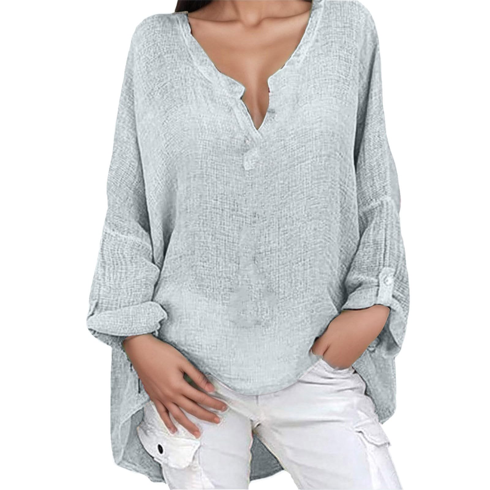 Womens Linen Shirt Oversized Blouse Summer Long Sleeve Lapel Button Casual Tee Shirts V Neck Loose Fit Business Office Henley Tops 1687-qppoj-grey-a 5XL