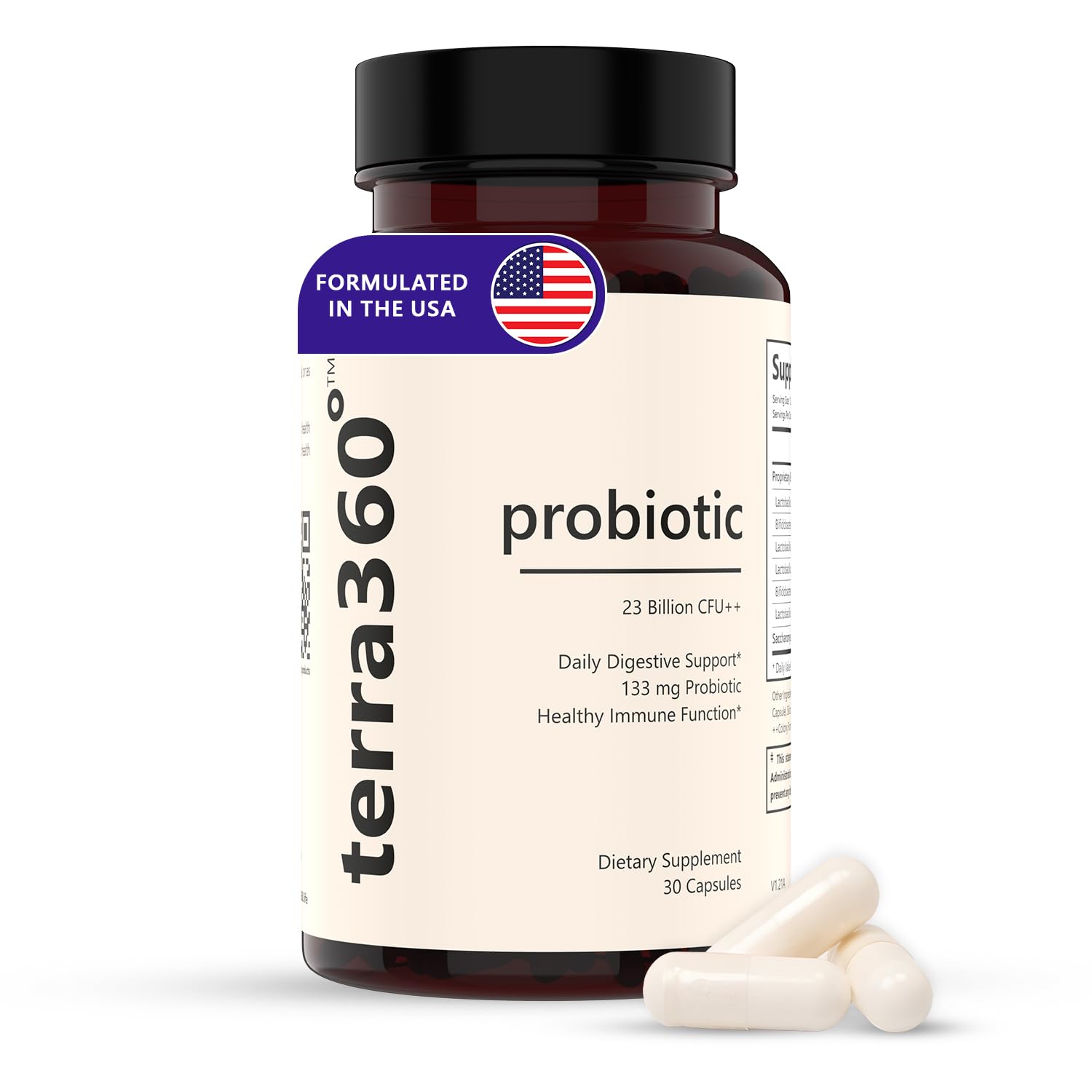 One Capsule Daily for Convenience: Designed for ease of use, this probiotic requires only one capsule per day, providing all-day digestive and immune benefits with each dose. 23 Billion CFU for Maximum Support: Each capsule contains an enhanced dose of 23 billion CFUs, providing strong support for digestive comfort, nutrient absorption, and immune function. Comprehensive Probiotic Blend: A diverse probiotic formula, terra360 Probiotic introduces a variety of beneficial bacteria to promote gut flora balance and optimize digestion naturally. Advanced Digestive Immune Health: terra360 Probiotic delivers 23 billion CFU per capsule, supporting digestive health, immune function, and a balanced gut environment for overall wellness.